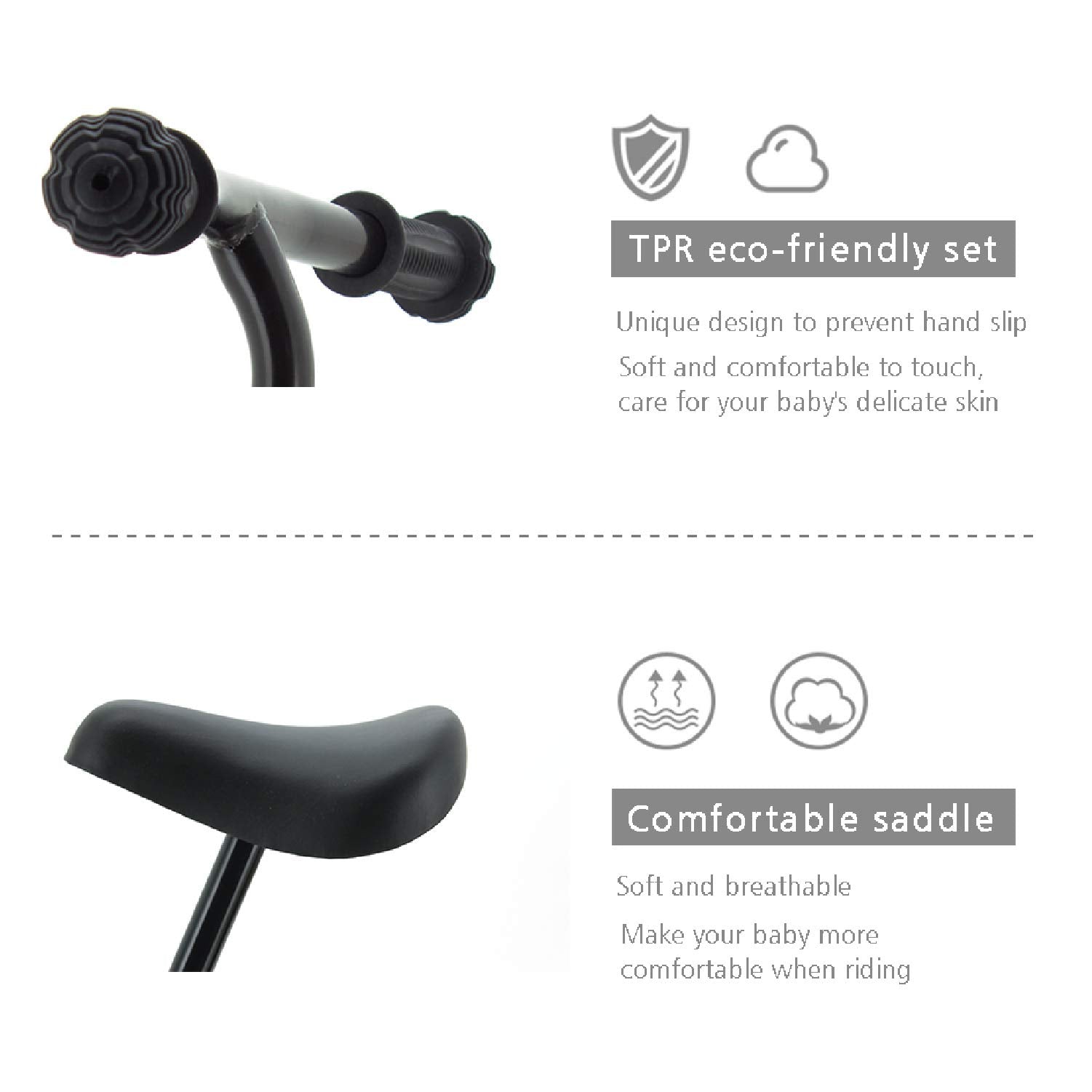 - SAFETY DESIGN: The balance bike without any sharp points, no pedals, non-slip grip handle design for child, 12 inches wear-resistant EVA solid tires and the shock absorption design of high density soft seat can care for children buttock. All materials are eco-friendly and non-toxic, approved by SGS.