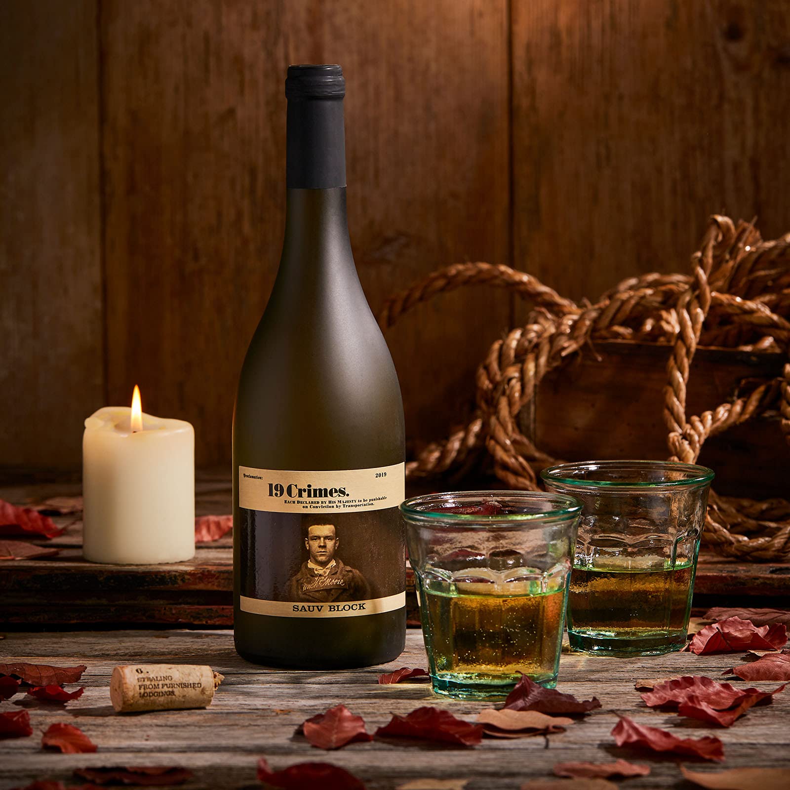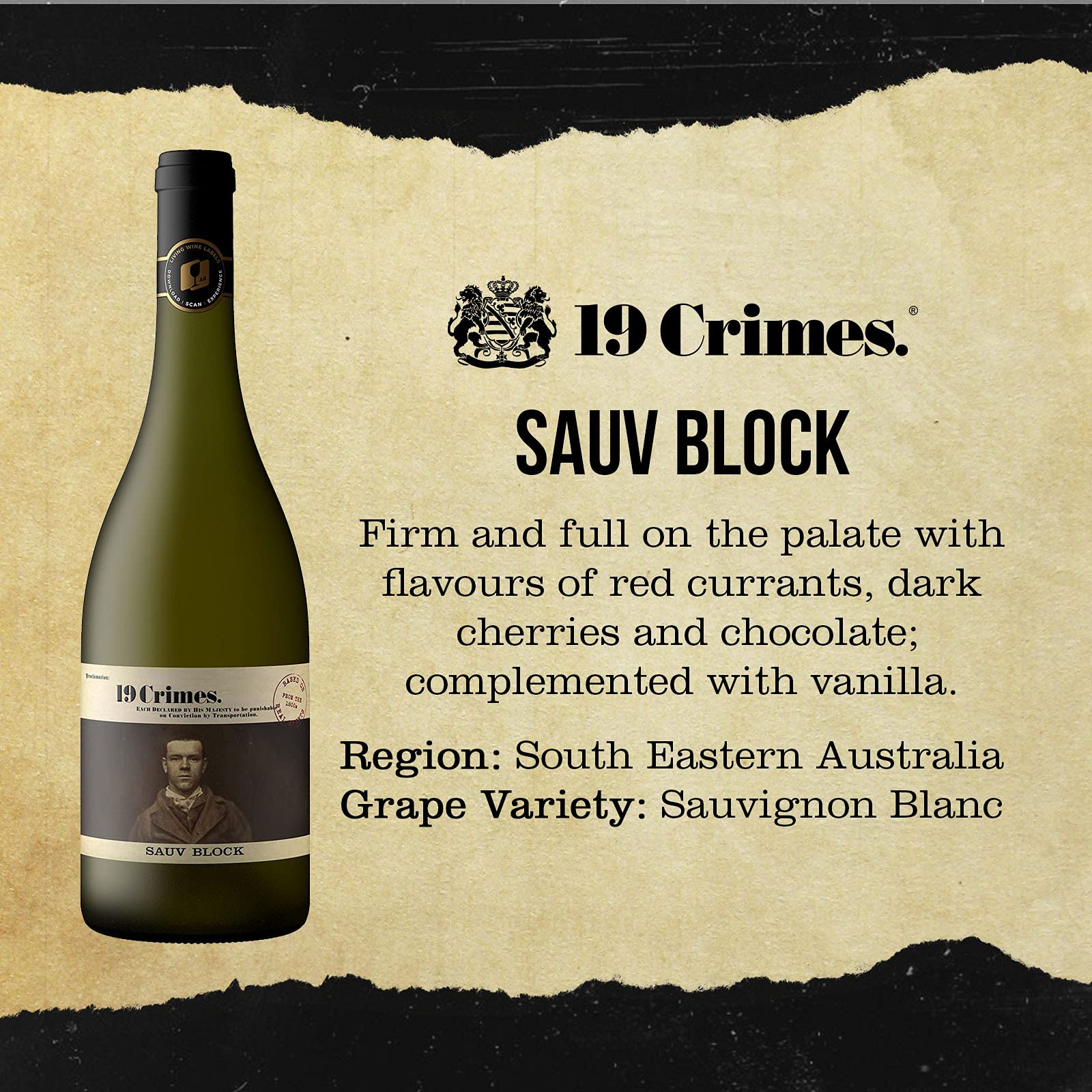 19 Crimes 'Sauv Block' - Vintage Sauvignon Blanc White Wine 75cl from South Eastern Australia (12% ABV). Lifted aromas of passionfruit, grapefruit, gooseberry and guava. Light bodied, fresh and crisp wine. Pairs well with Fish tacos, loaded nachos and roasted mixed vegtables. Serve chilled. Best served now, but can be stored for up to 1 year. 19 Crimes wine celebrates Australia's infamous origin, and the stories of these men and women convicts-turned colonists. 19 Crimes is defiant by nature, bold in character, and always uncompromising