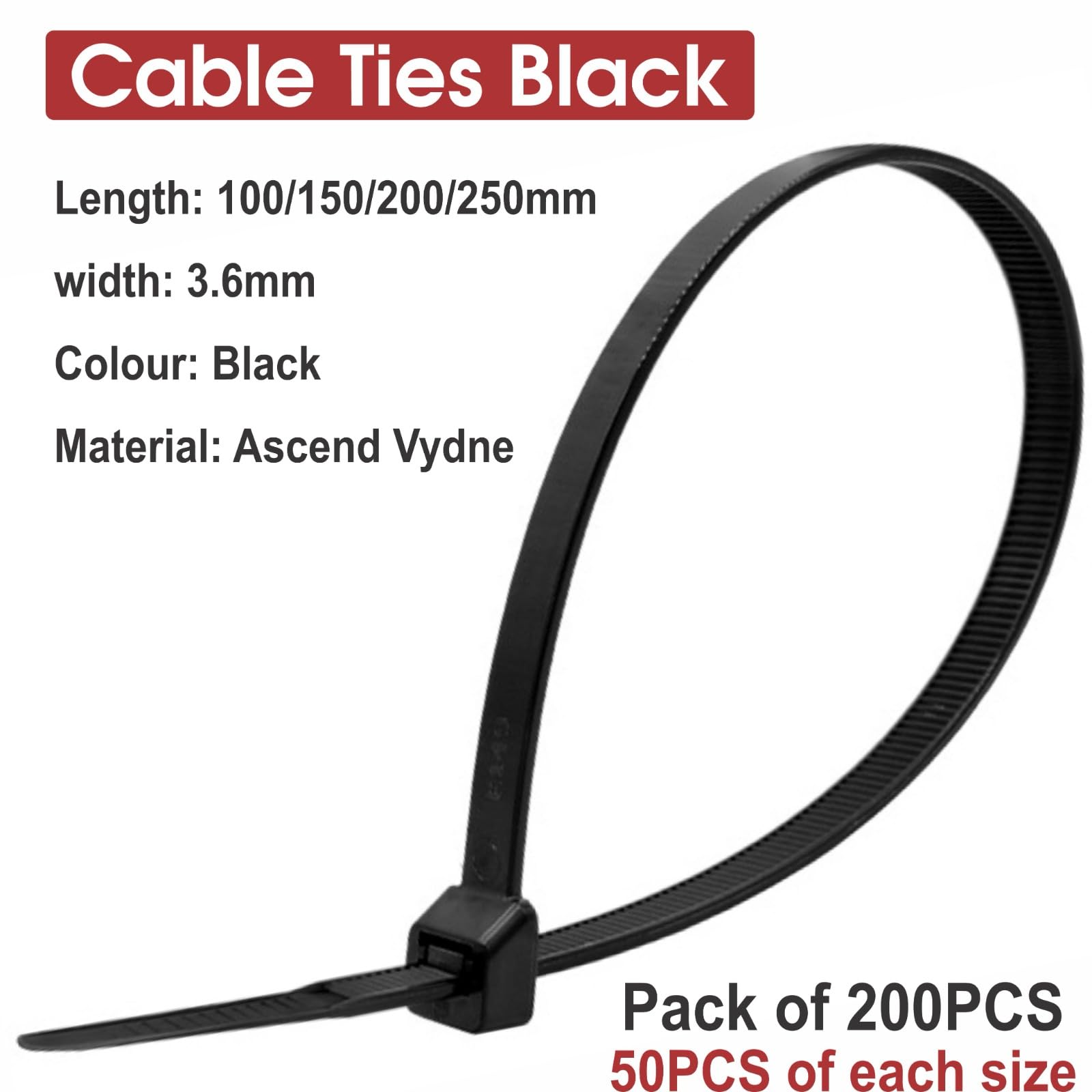 - All Mixed Black Cable Tie Set: Convenient set includes 50 sturdy black zip ties in each of the 4 most useful sizes - 100mm, 150mm, 200mm, and 250mm lengths with 3.6mm thickness of all sizes - for a total of 200 nylon cable ties