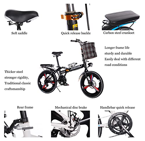 Details: šfoldable bicycle 6-speed gearbox: suitable for all situations. City bikes have a strong braking power and contribute to road safety. This eye-catching bike is an everyday city bike!šSuspension ForkA shock-absorbing front fork absorb shock from bumps and dips. The thickened steel pipe tube prolongs the service life, firm and solid, not easy to wear and tear,It can comfortably adapt to various road sections, has a good shock absorption effect.šRear SuspensionThe rear suspension can make the stroke softer at the beginning, so that it can be more sensitive when passing small bumps, and it is more supportive when approaching the end of the stroke, so as not to bottom out.Material: aluminum alloy and carbon steel carPedal Type: non-slip pedalBrake type: disc brake, holding brakeShock absorption: front and rear double shock absorptionTire: three cutting wheelTire size: 50 cmProduct size: 150 x (68-98) x (100-115) cm / 59 x (26.8-38.5) x (39.3-45) inchesProduct folded size: 78x60x35cm / 37x34x15inGross weight: 20 kgProducts include:1 x bike1 x kettle1 x car light1 x car bell1 x back cushion1 x tool1 x pump1 x car lock1 X Car basketšAs a reminder: 95% of the bikes are installed. All you have to do is adjust the height of the handlebars and the seat. It only takes a few minutes to complete and start your bike tour.