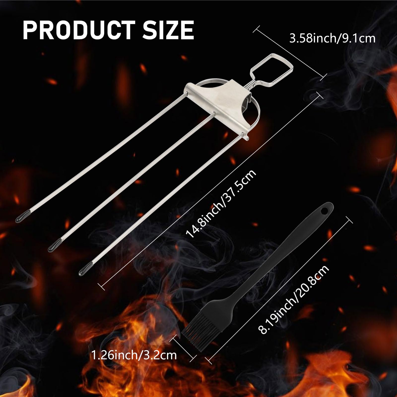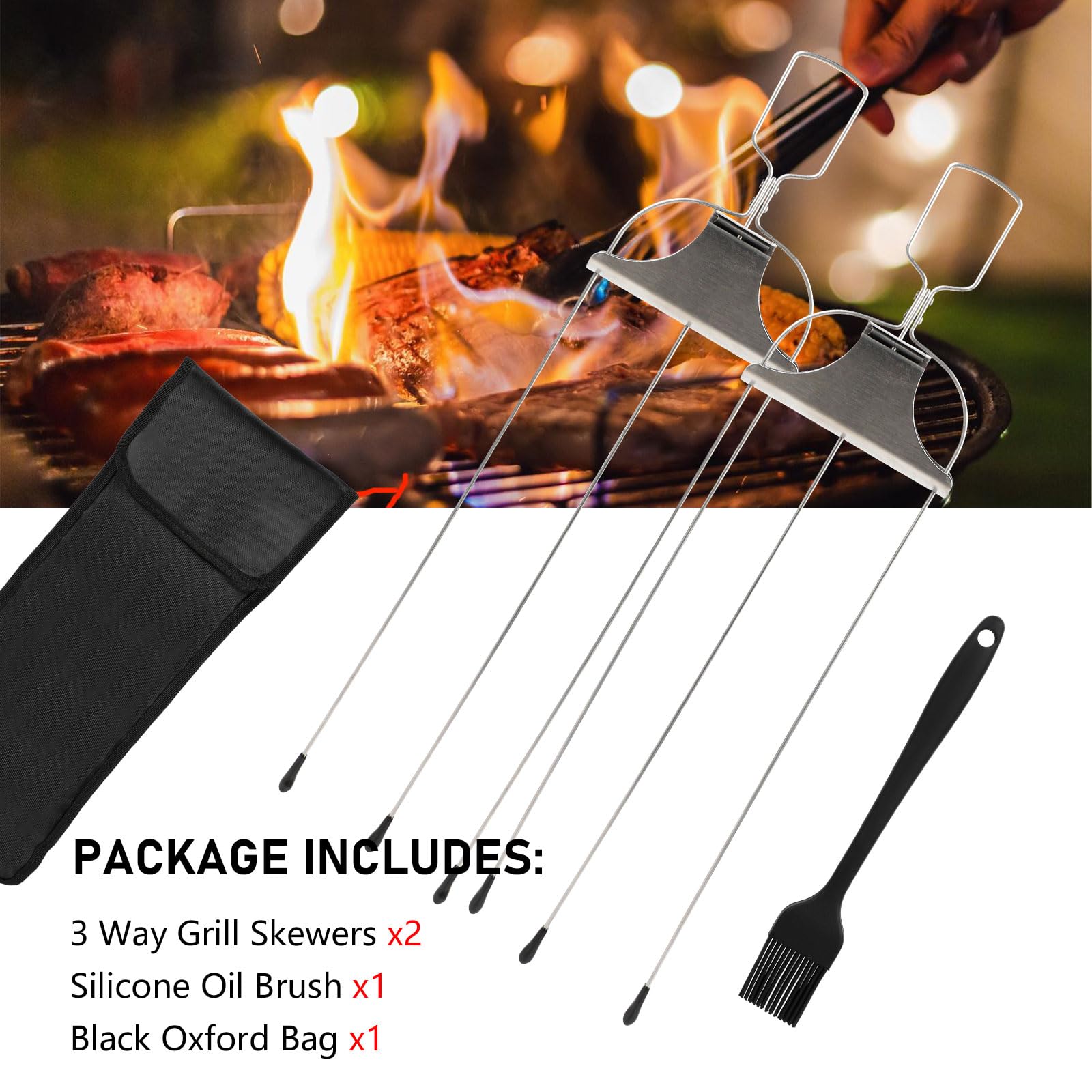 - PRODUCT & SIZE: You will receive 2 stainless steel 3-prong barbecue skewers, 1 silicone oil brush, and a black oxford bag to store the product. The length of the barbecue skewer is 14.8 inches, which provides enough space for grilling more food at the same time; the length of the oil brush is 8.2 inches, which is long enough to effectively prevent hands from being burned by high temperature when brushing oil.