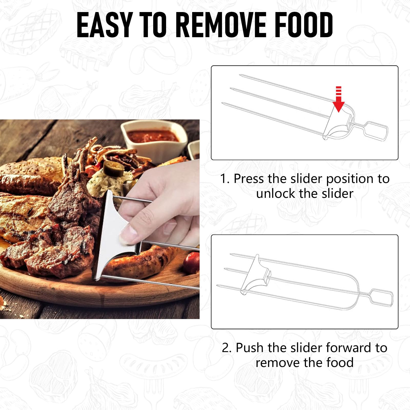 - EASY TO TURN OVER AND REMOVE FOOD: Our BBQ skewers can grill 3 skewers of food at a time, and through the ergonomic handle, you can easily turn over the food; the barbecue skewers are also designed with a push bar slider, press and hold the slider and push forward to easily remove the food , and won't stain or hurt your fingers.