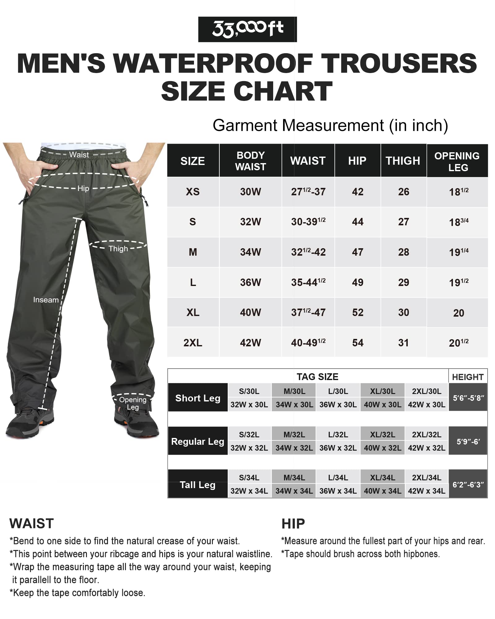 - VARIOUS OCCASIONS -- 33,000ft windproof rain trousers can effectively prevent 95% UV,wrinkle resistant and easy to clean. These waterproof breathable rain trousers for men with complete protection in wind and inclement weather. Great for golfing, walking, camping, cycling, fishing, traveling, hiking, trekking and other outdoor activities.