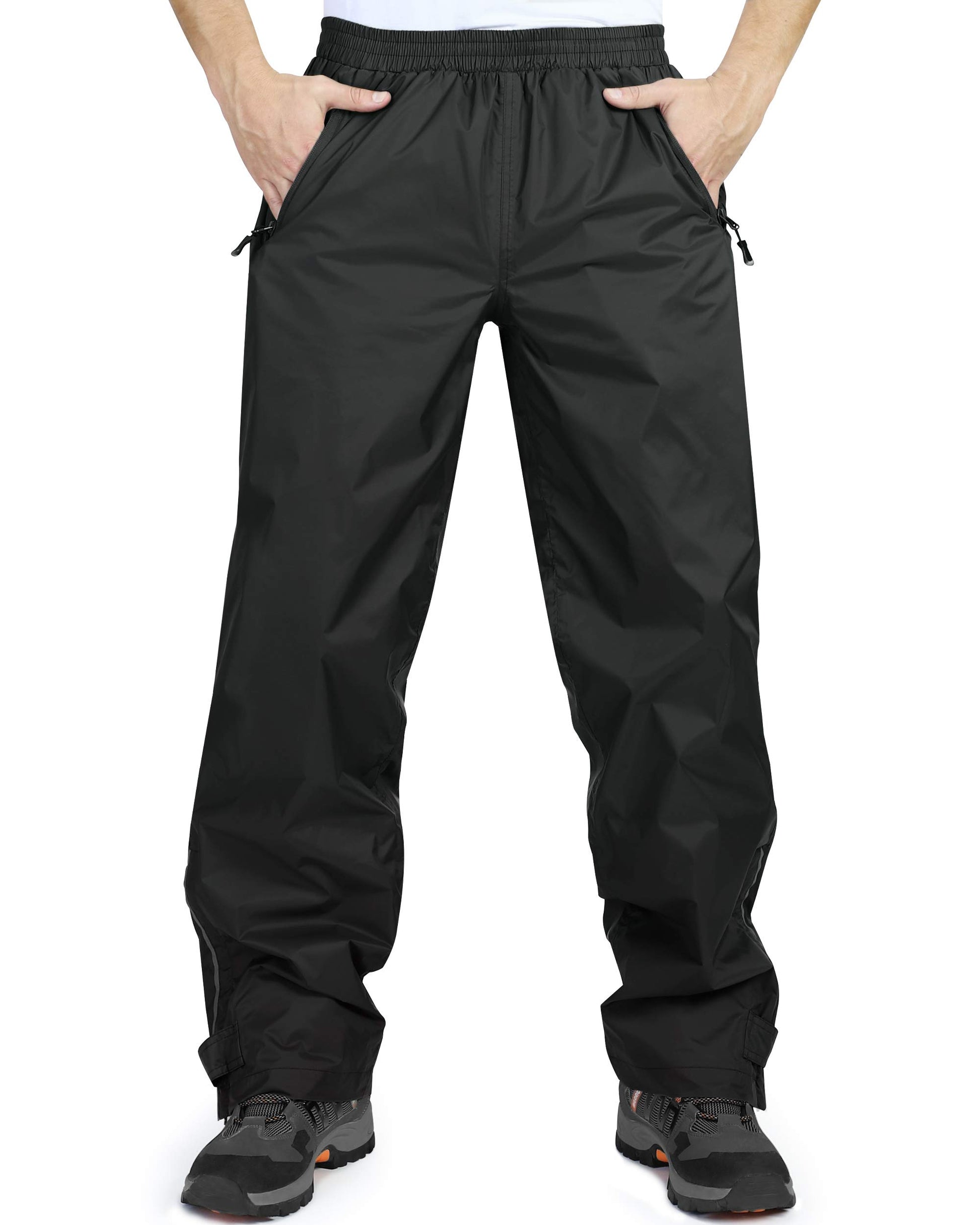 - REFLECTIVE STRIPS & VELCRO DESIGN -- 33,000ft Mens side opening waterproof trousers. The Reflective strip keeps you high visibility during outdoor activities. These rain pants for men have a half-leg zipper, it allow you to pull the clothing on over your footwear for speed. The Velcro closure at bottom leg allows adjust the width for different fits and occasions.