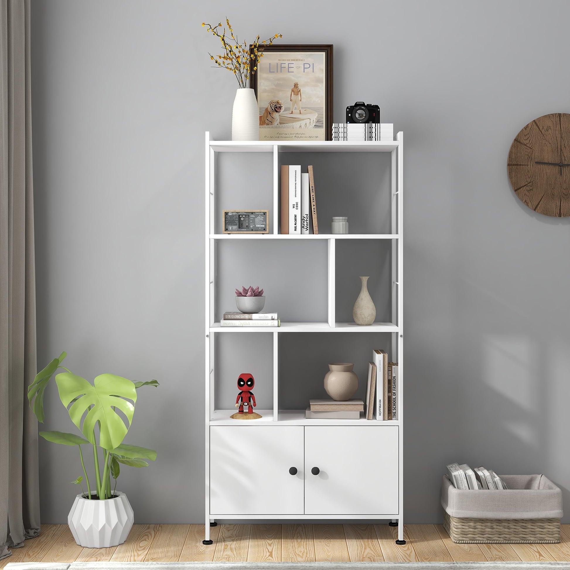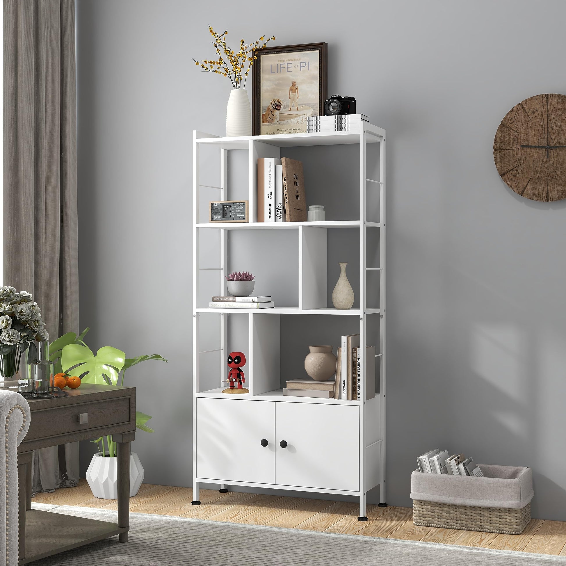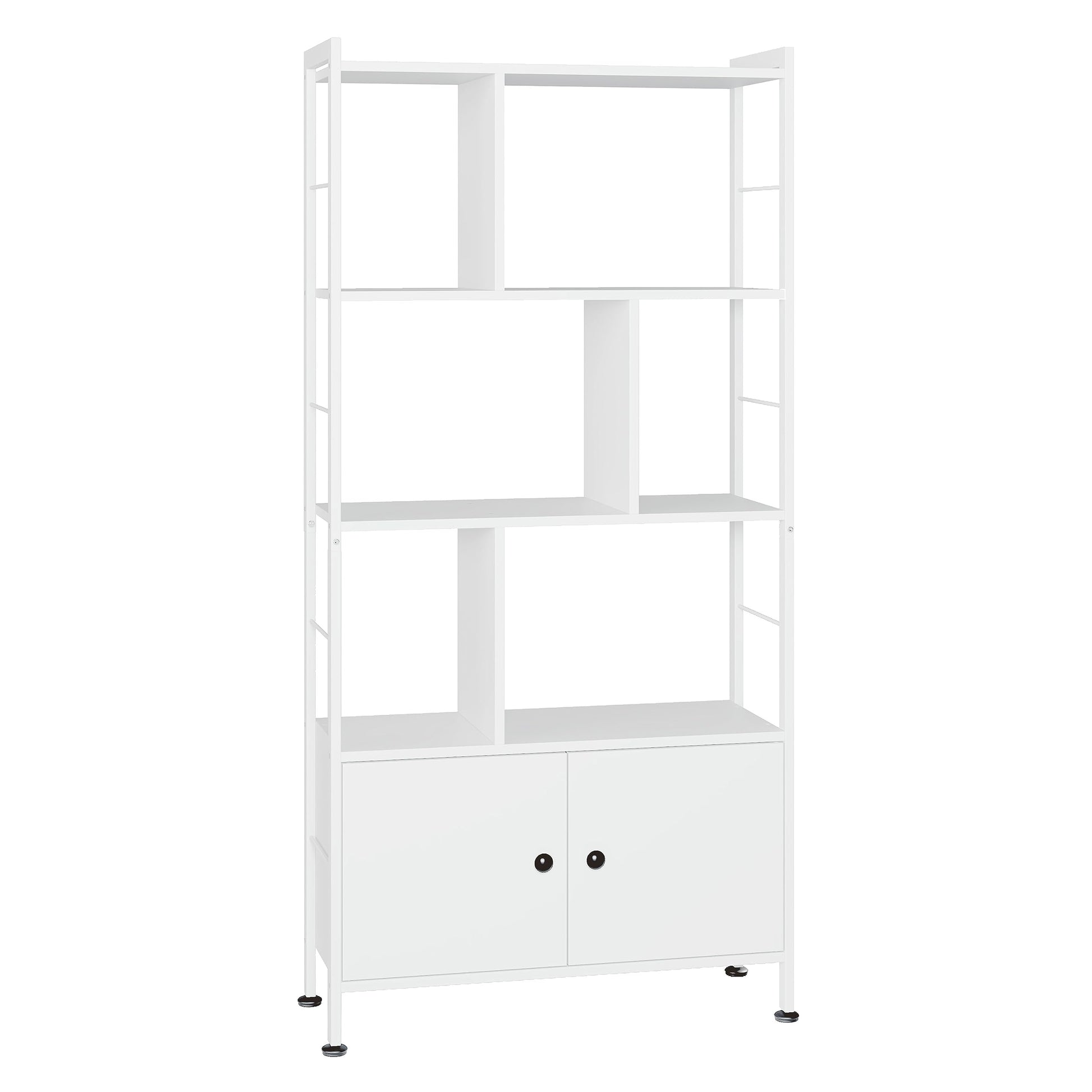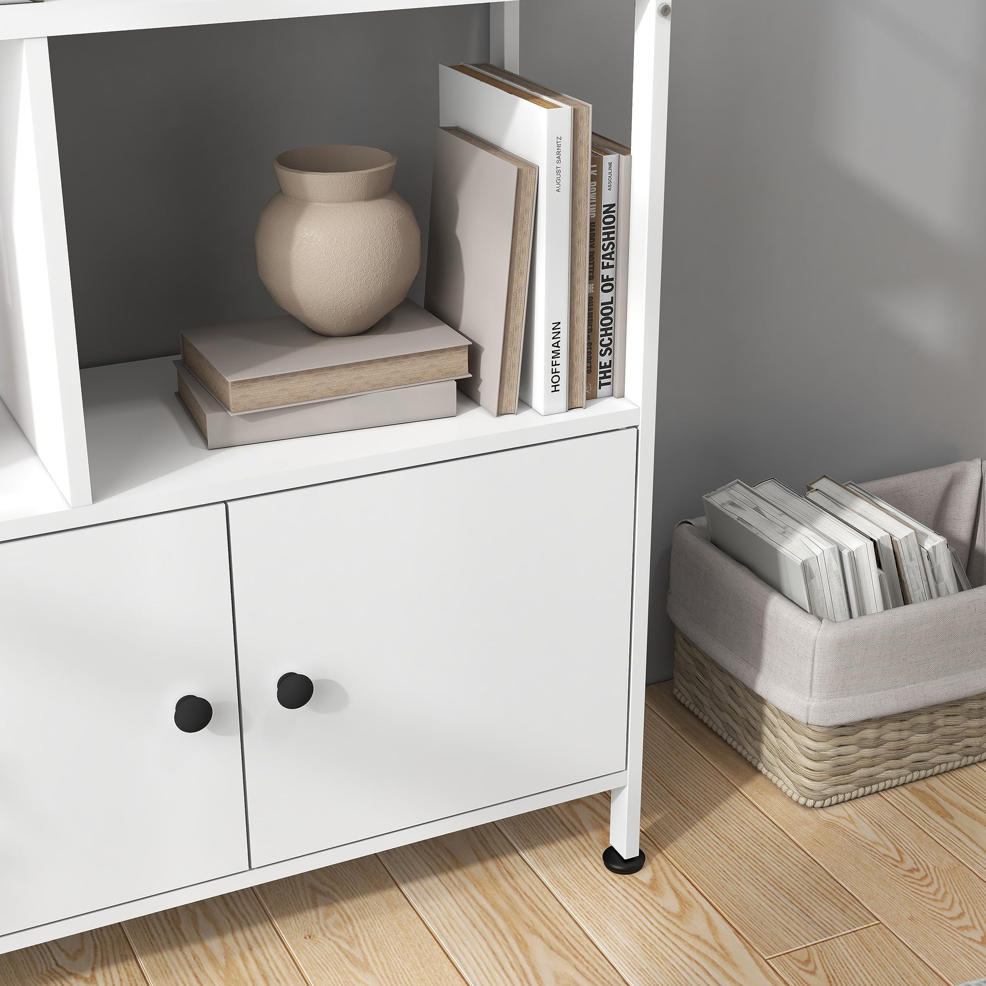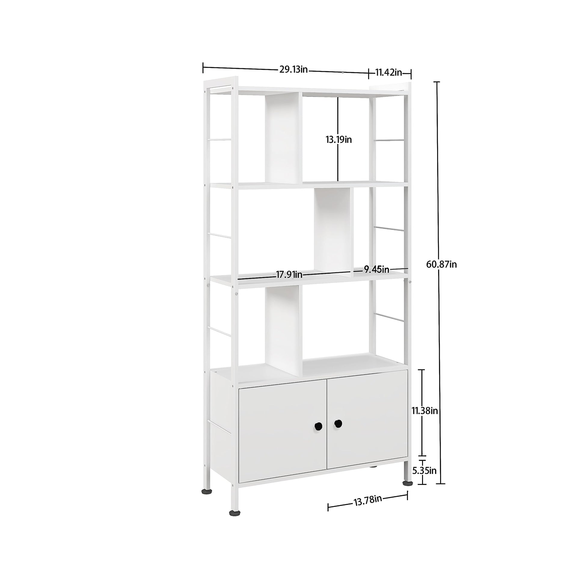 4 Tier Bookcase, Large Steel Frame Bookcase Wooden Cube Shelves Tall Storage Shelf Cupboard Organizer Display Industrial Style Free Standing Unit for Living Room, Office (White, 4 Tier with 2 Doors)