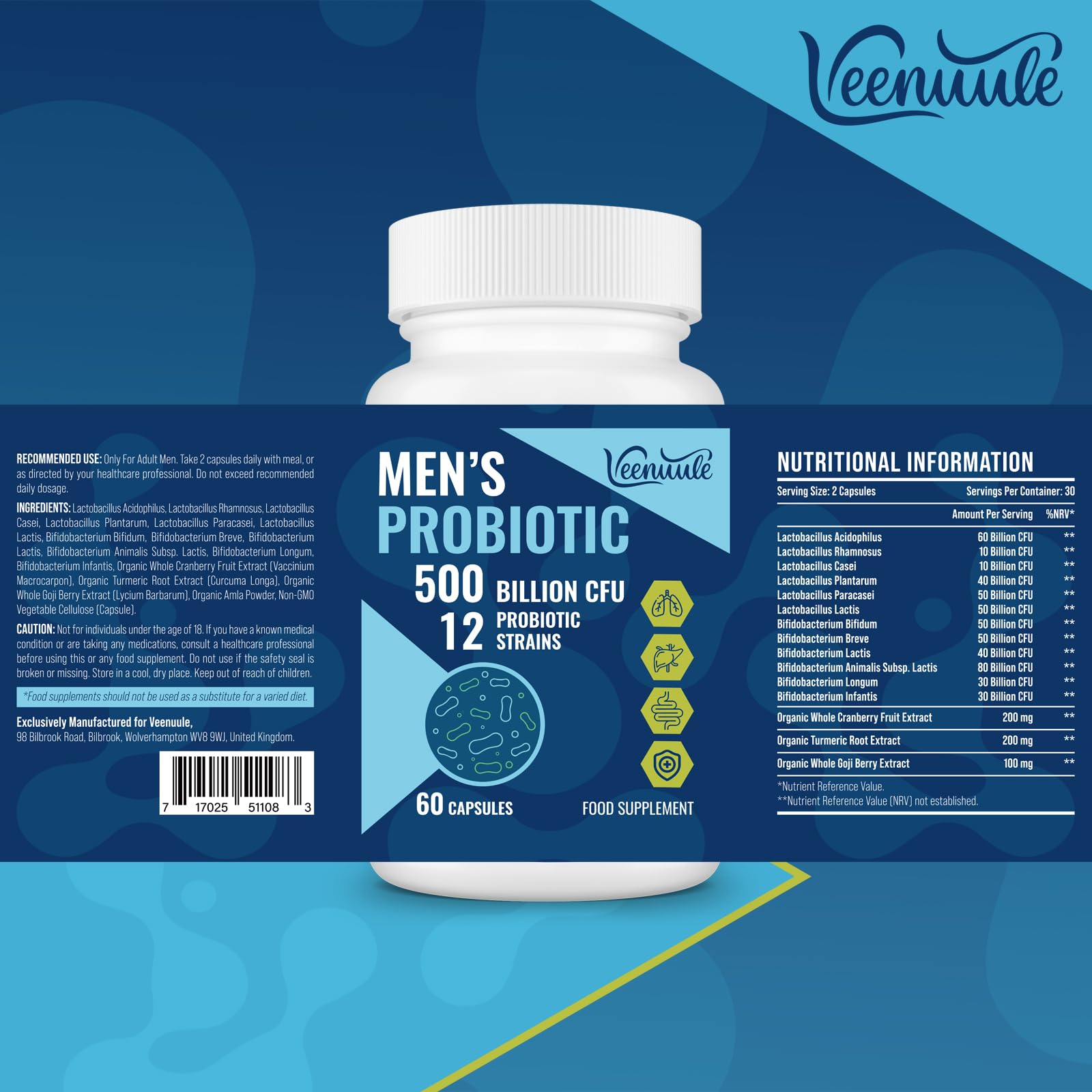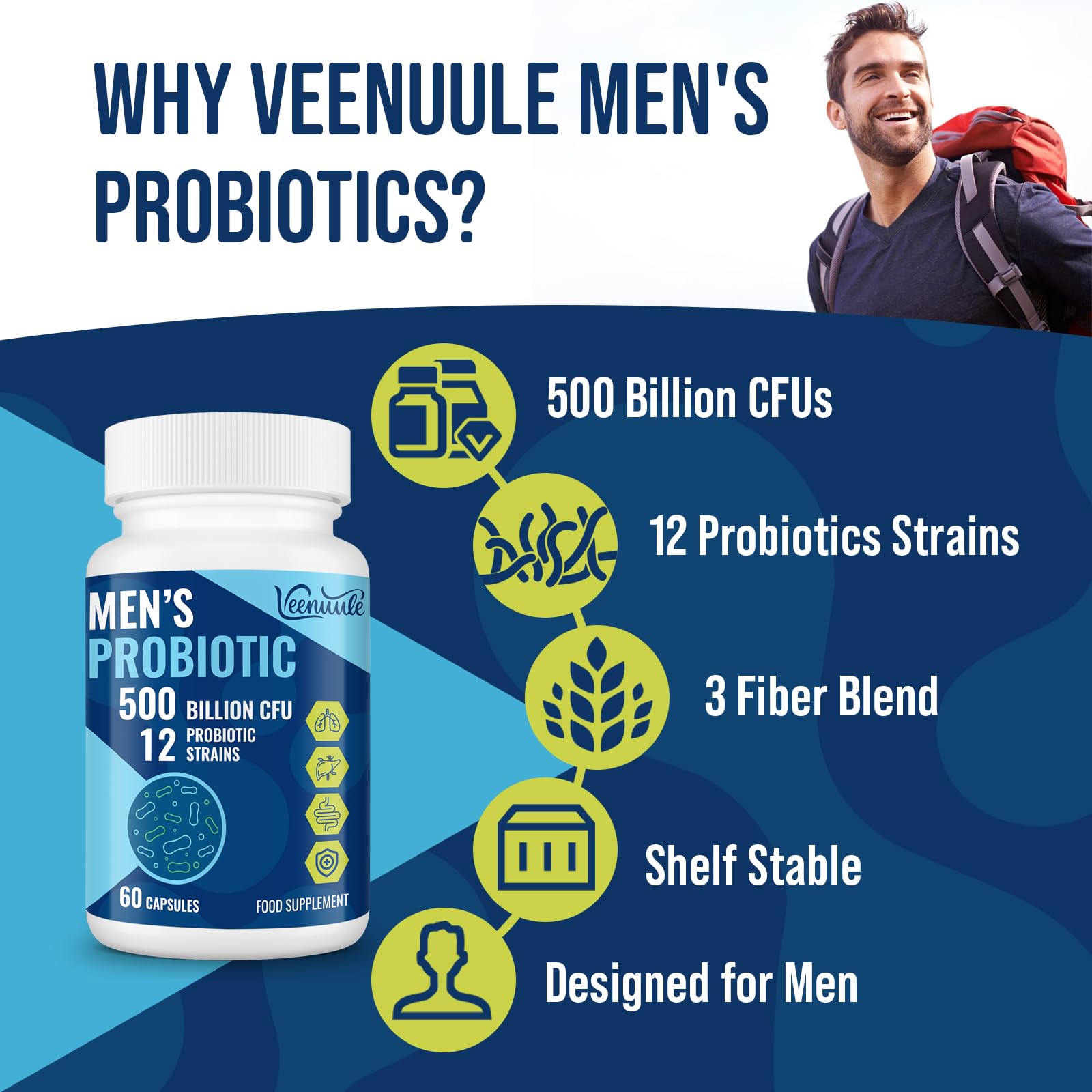 - MEN'S ULTIMATE CARE PROBIOTICS: Veenuule probiotics have been specially designed to meet the unique needs of men's bodies and digestive systems. Formulated with 500 Billion CFUs plus clinically proven 12 probiotic strains, it promotes and sustains a harmonious balance within the stomach, ensuring optimal digestive health. Research has demonstrated that probiotics offer comprehensive support for maintaining a healthy microbiome in men's bodies.