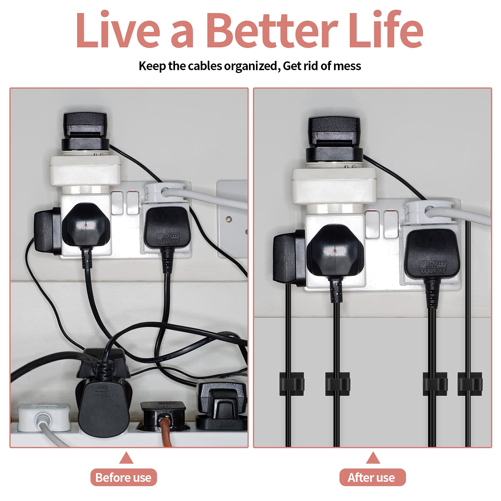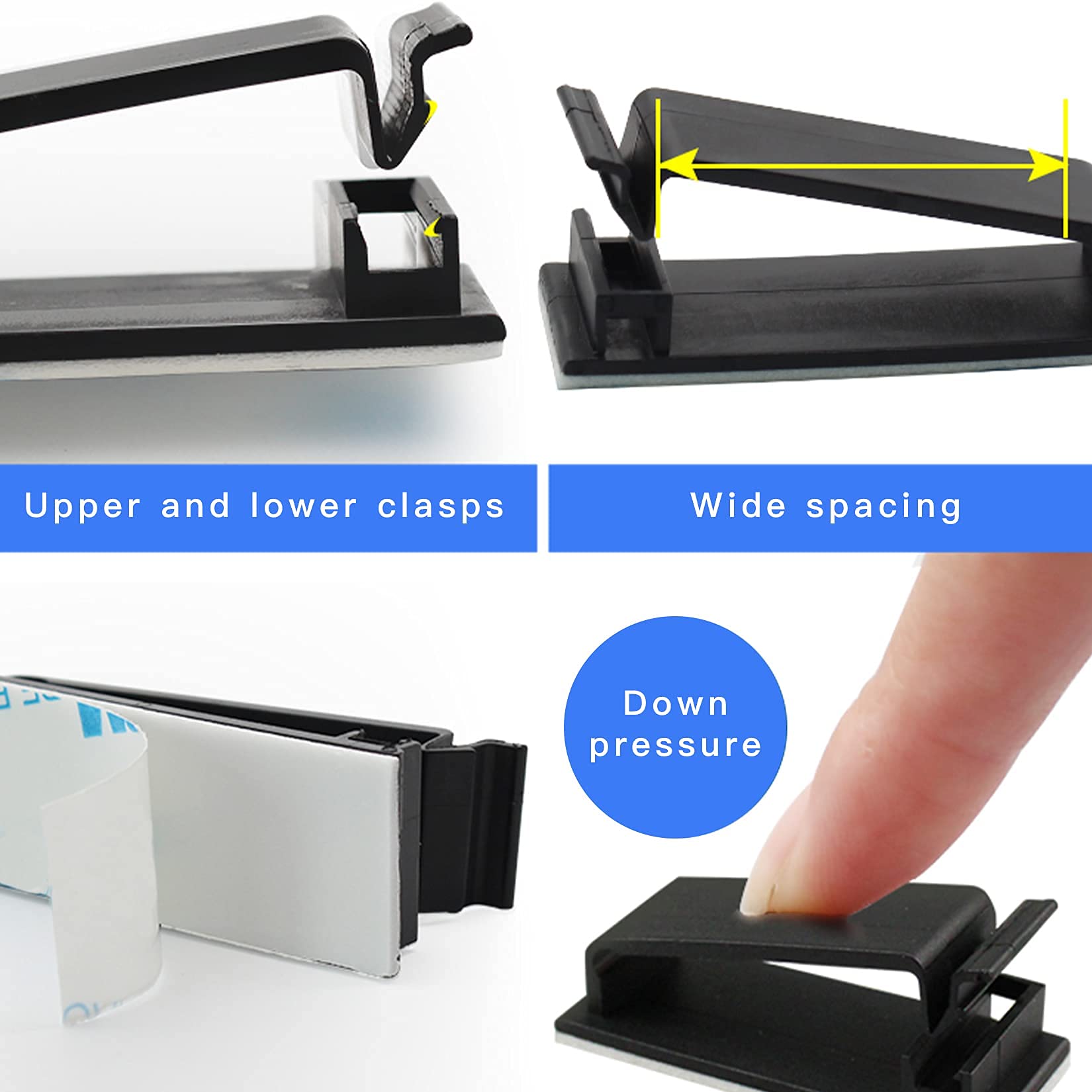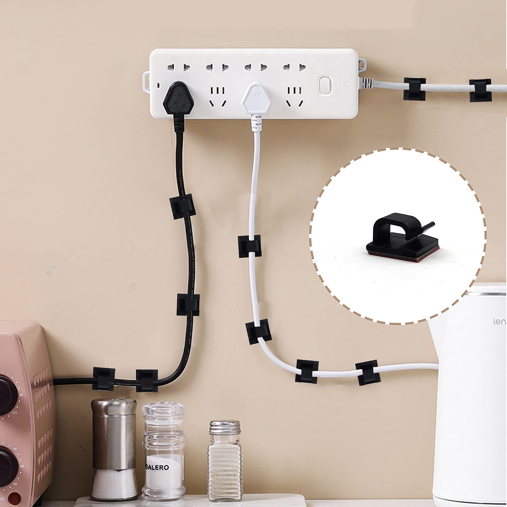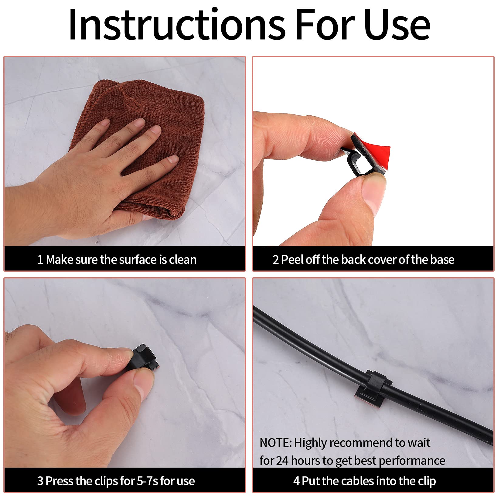 - 【Easy to Use】Our cord management clips are easy to use. Just simply peel off the back cover, and pasted on the cleaned surface you want to paste. Note: In order to get best performance, please make sure the mounting surface is clean. No dirt, dust, grease, etc.