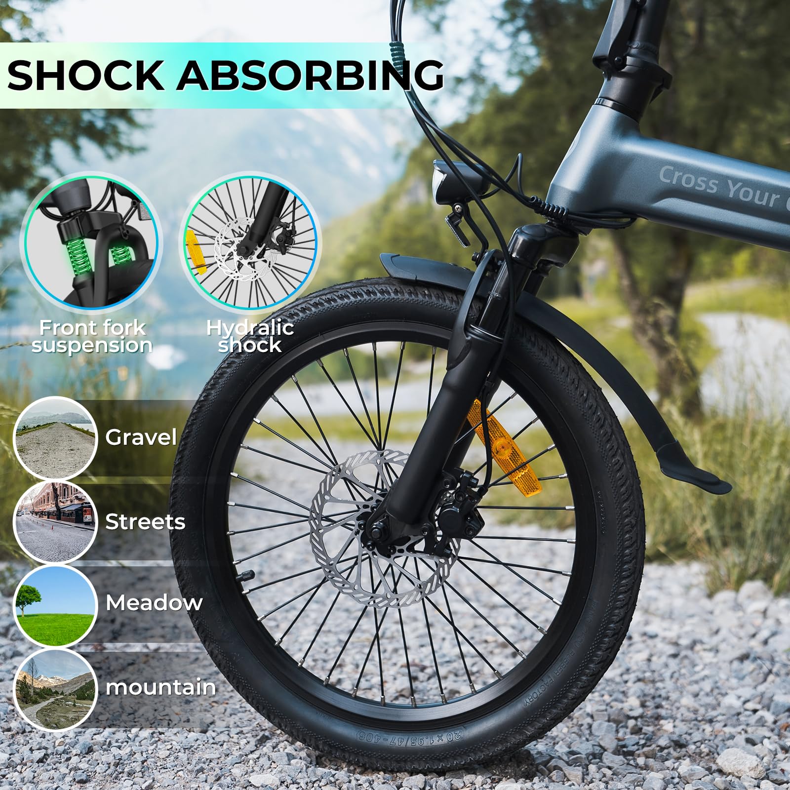 - 🚴♀️【Safe and Comfortable】- The frame of this 20 inch e bikes is made of aluminium alloy, which is very light and very strong. This makes it a mountain bike suitable for mountain bikes. The shock absorber front fork is robust and reliable and has a strong shock absorption effect. Treat yourself to a comfortable riding experience, whether on mountain roads, motorways or forest roads.
