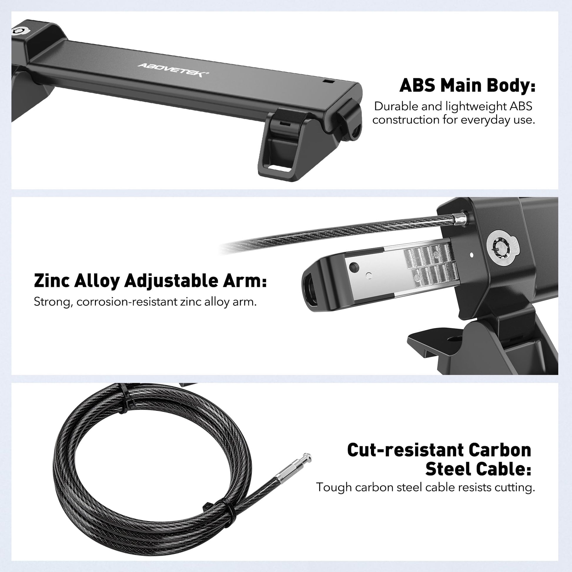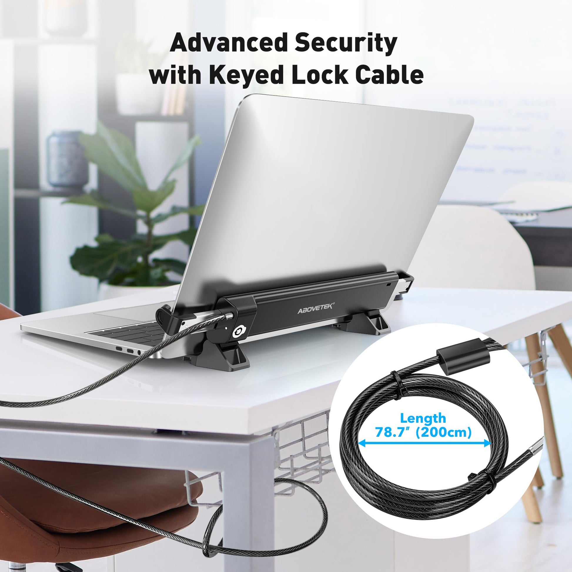- Enhanced Security with Keyed Lock and Long Cable: The AboveTEK MacBook locking comes with a keyed laptop lock and a lengthy 2m cable, ideal for securely tethering to any fixed structure. It also includes mounting options for desk attachment, ensuring your laptop stays safe and secure.