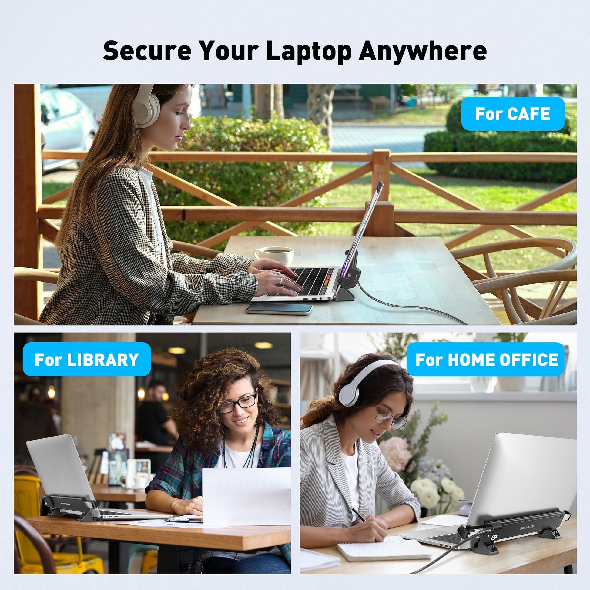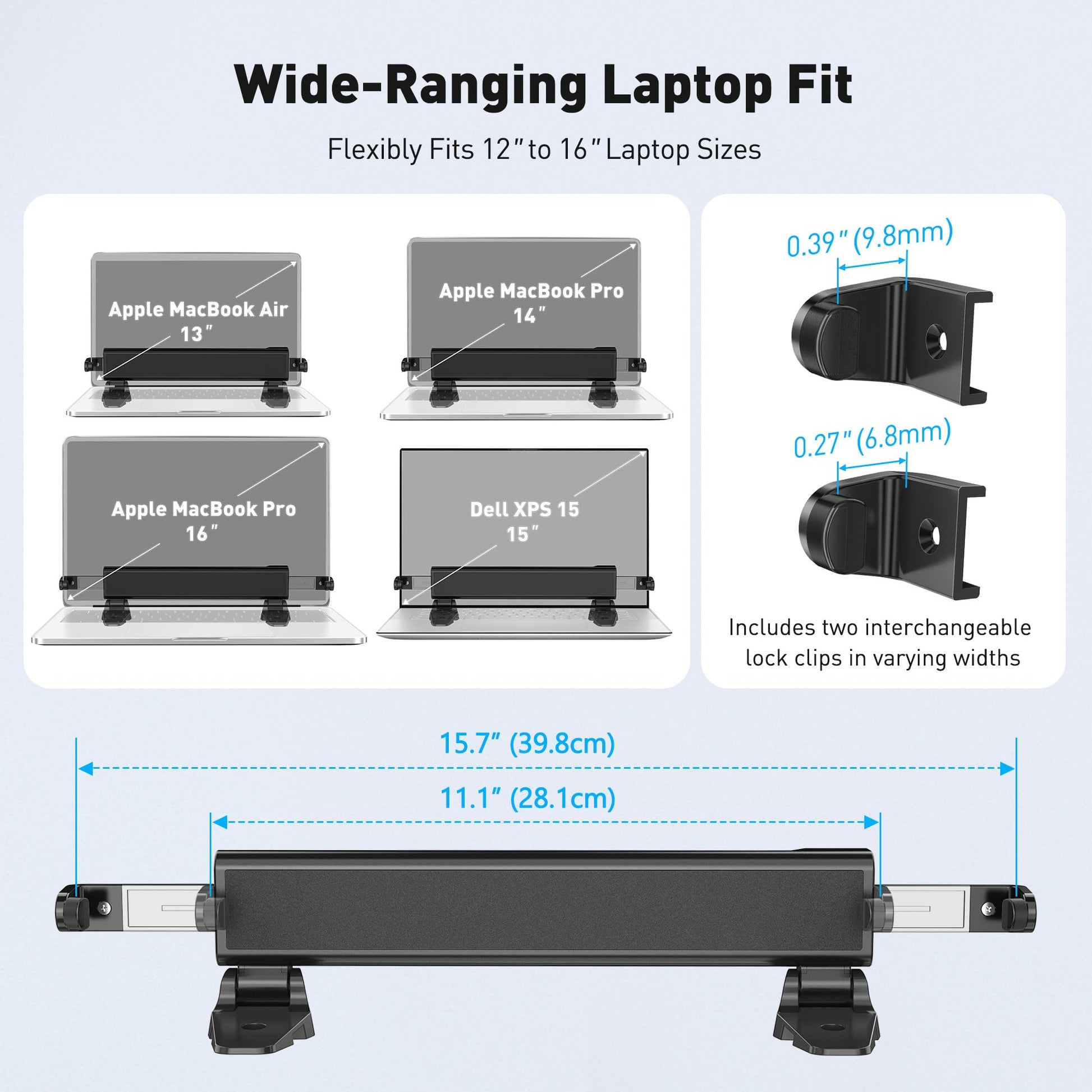 - Universal Fit for Diverse Laptops: Our AboveTEK Locking Station is designed to fit a wide range of laptops from 12" to 16", including MacBook, MacBook Air, Surface Pro and Chromebooks. Its adjustable arms accommodate widths from 28.19 cm to 39.88 cm, ensuring compatibility with various models.