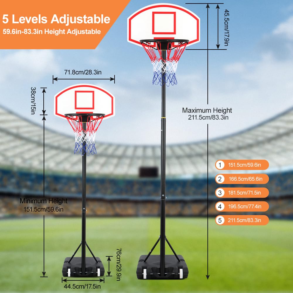 Details: Five Adjustable Height Basketball Hoop abd Stand--- Our basketball hoop set designed for 5 height adjustable for your different needs from 4.9-6.9FT, growing with your kids.