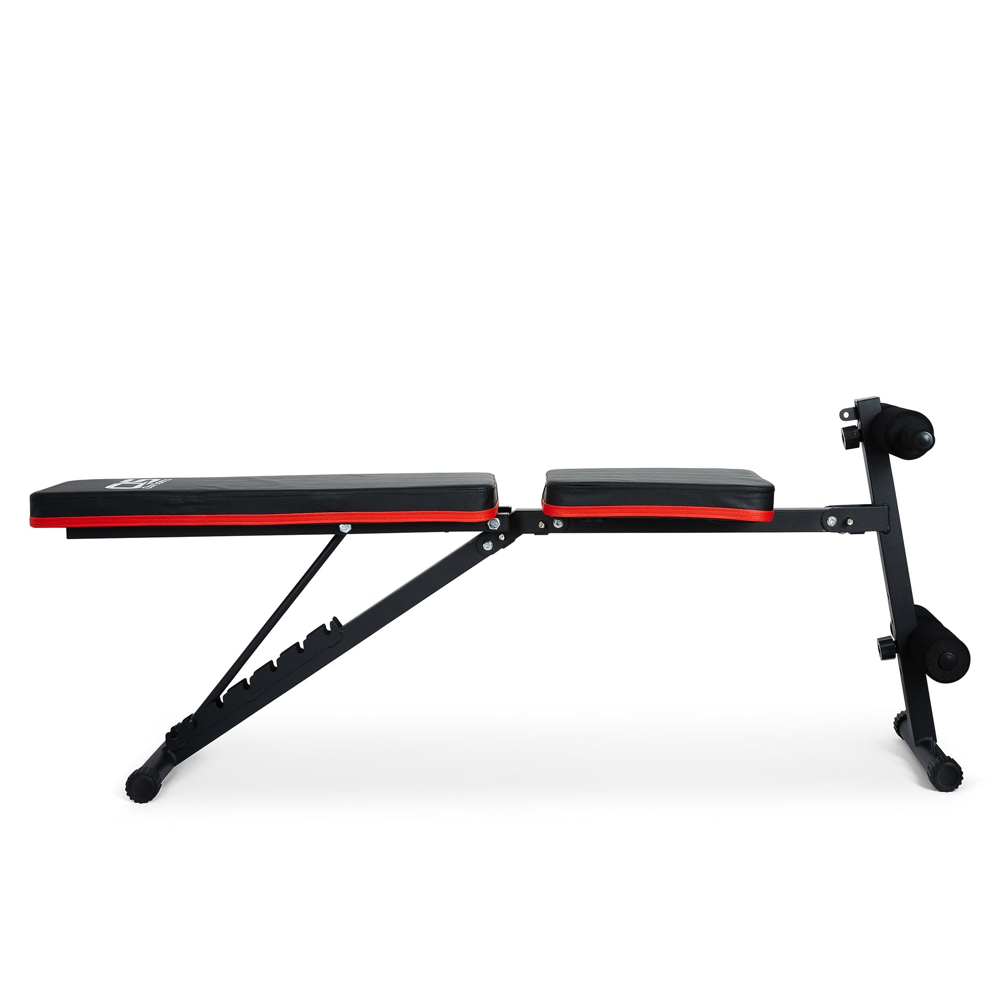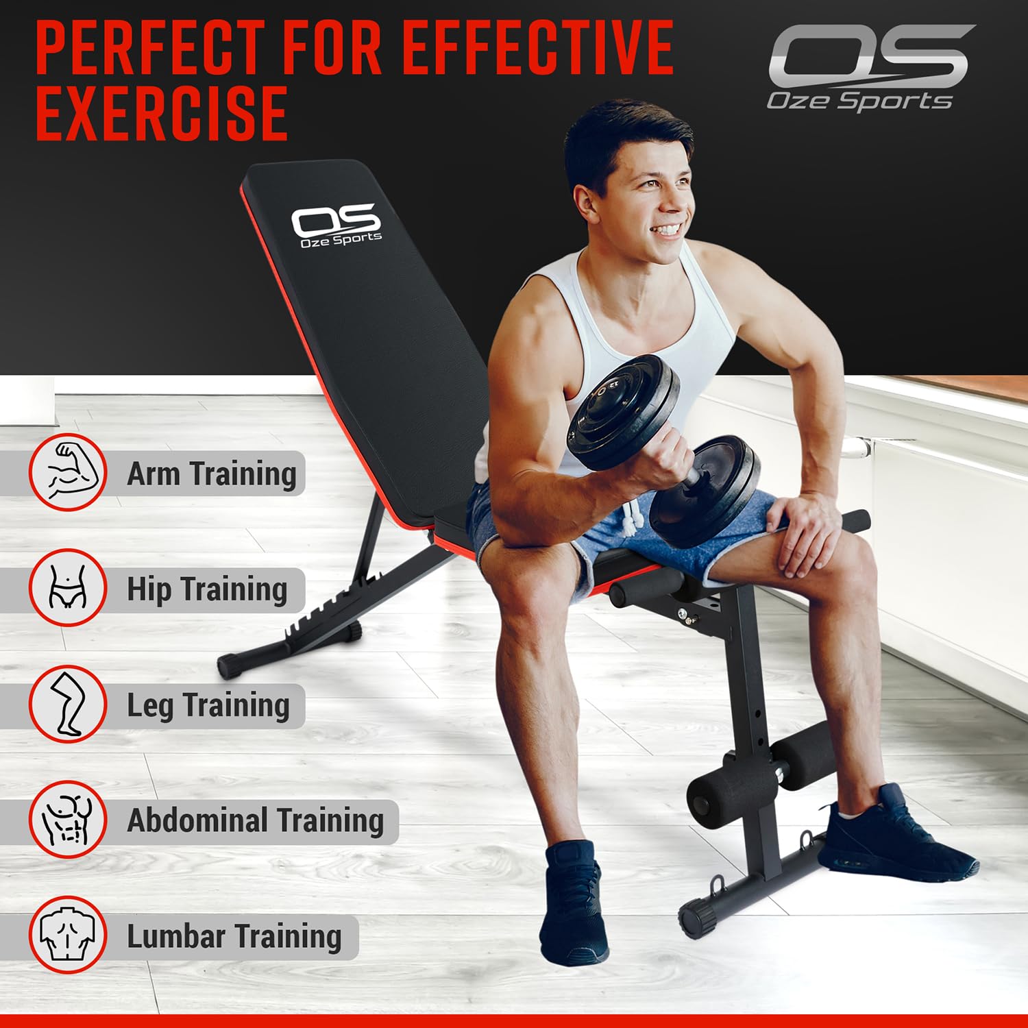 Details: Multifunctional Easy to Assemble Weight Bench OZE Sports Weight Bench is made from high grade gauge steel and has thick backrest to support a user up to 100kg and provide outstanding comfort. The backrest of the weight bench has 7 adjustable positions while the foam rollers have 4 adjustable positions so you can train your chest, arms, legs, shoulders, back and abs with total ease. Weight bench is easy to assemble and folds way for storage.