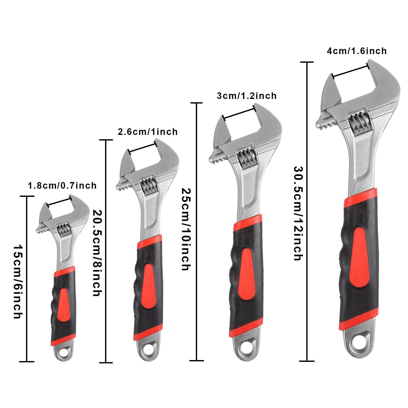 - - [4 Size] This set includes 4 different sizes: 15cm/6in, 20cm/8in, 25cm/10in, and 30cm/12in. Each spanner has a maximum opening capacity of 22mm, 27mm, 35mm, and 38mm respectively, ensuring they can meet your everyday needs.