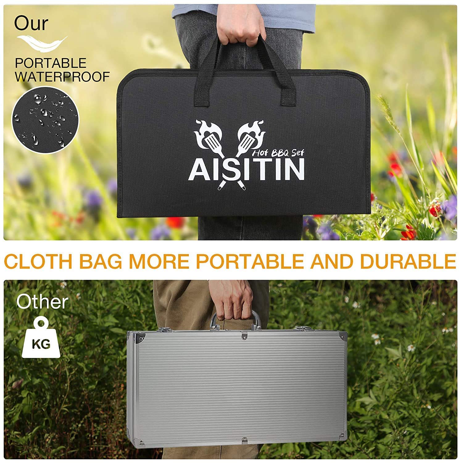 - 【Portable BBQ Tool Set】: BBQ accessories are stored in portable and durable tote bag that is lighter than the aluminum packaging box, which is more convenient to carry. Travel, camping or hiking can bring our AISITIN barbecue accessories.