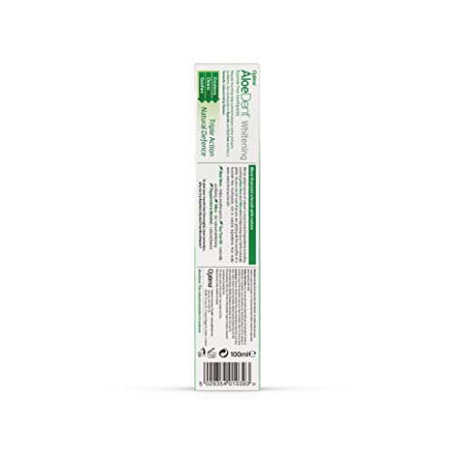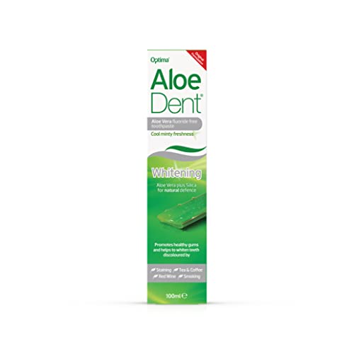 Aloe Dent Aloe Vera Toothpaste, Whitening - 100ml Aloe Dent Whitening Toothpaste harnesses some of nature's most powerful and effective cleaning ingredients so you can whiten your teeth gently and without harsh abrasives. Aloe Vera and silica clean, whiten and sooth whilst essential oils of tea tree oil, peppermint and menthol freshen breath and protect gum health. With no fluoride and no harsh chemical cleaning agents, this toothpaste is ideal for sensitive teeth which need a triple-action whitening touch. Note: Item has PAO symbol, expires after 12 months from opening.