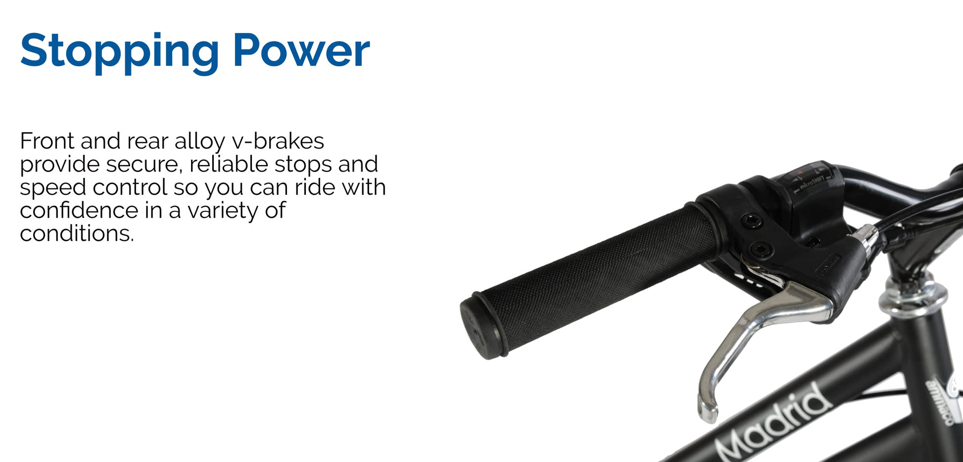 - Stopping Power: Front and rear alloy V-brakes provides secure, reliable stops and speed control so you can ride with confidence in a variety of conditions.