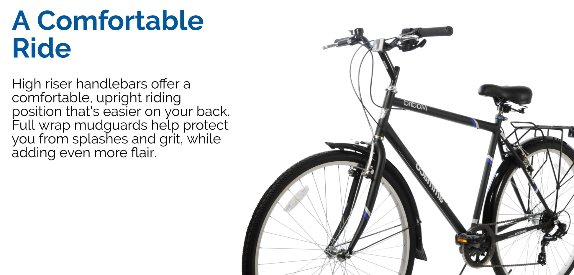 - A Comfortable Ride: High riser handlebars offer a comfortable, upright riding position that's easier on your back. Full wrap mudguards help protect you against splashes and grit, while adding even more flair.