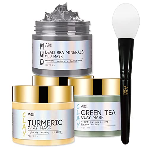 ANAiRUi Turmeric Clay Mask - Green Tea Detox Clay Mask - Dead Sea Minerals Mud Mask, Spa Facial Mask Set for Deeply Cleansing, Detoxing, Reducing Acne, Pores and Blackheads, 210g