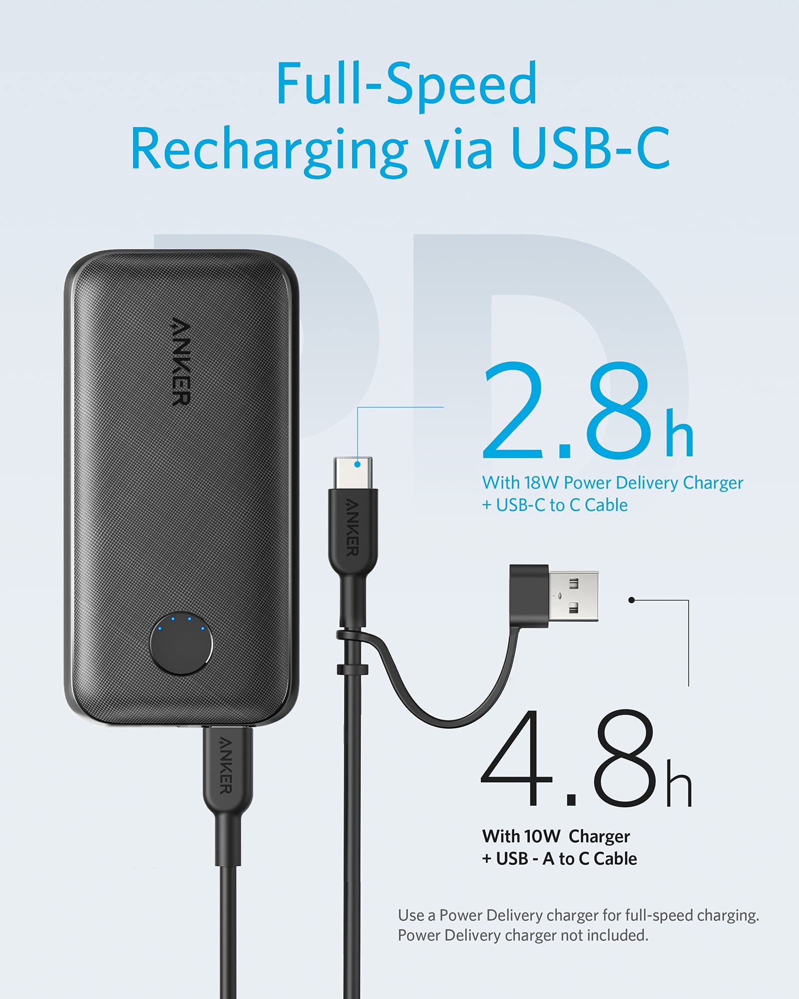 - Rapid Recharging: Refuel the PowerCore 10000 Redux in a mere 2.8 hours with a USB-C Power Delivery wall charger (not included). Alternatively, using a USB-A charger (not included) and a USB-A to USB-C cable will take around 4.8 hours.