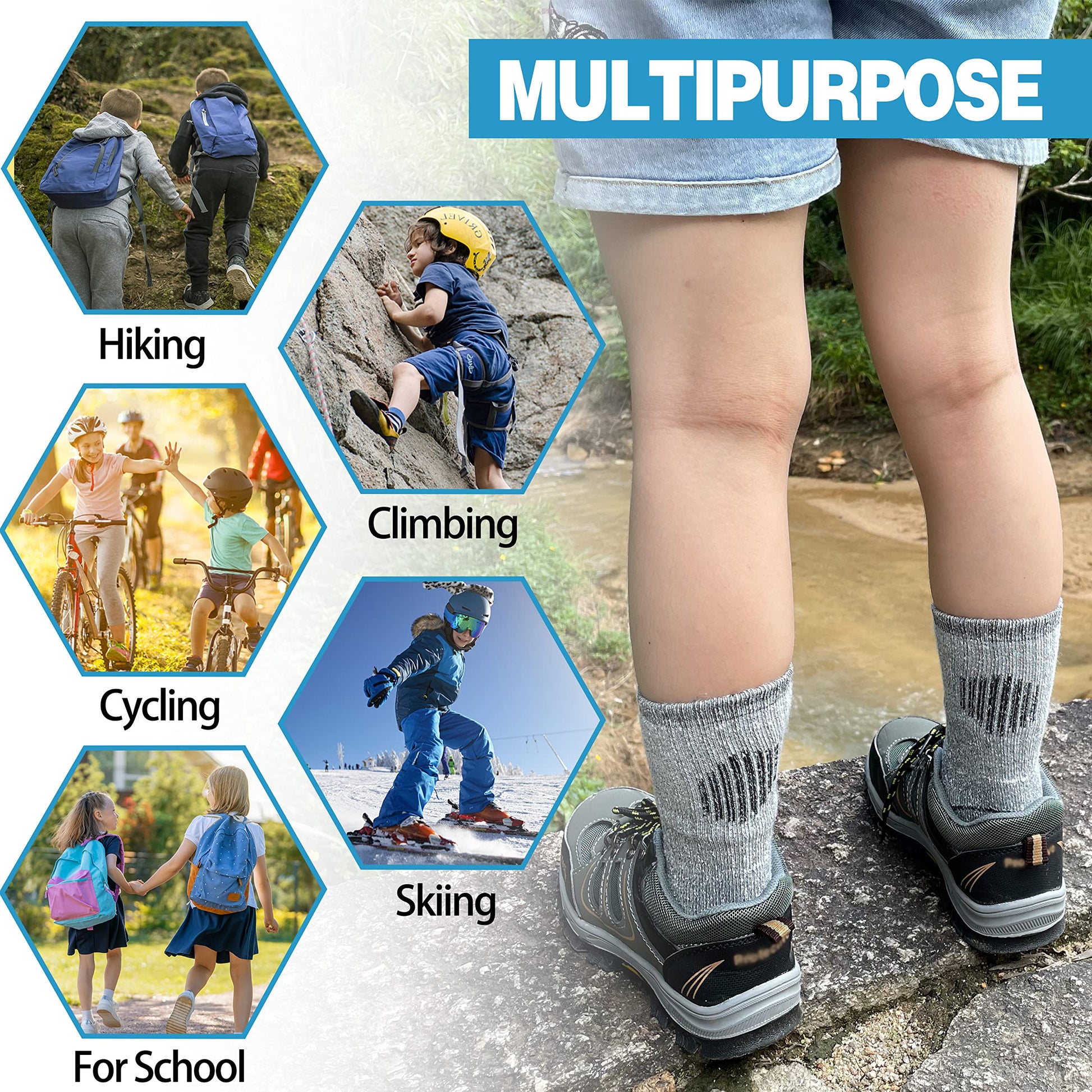 - PACKAGE INCLUDED - Here are 4 pairs merino wool hiking socks for kids.They are suitable for hiking , running ,skiing , gym class ,playing outdoor or other activities.