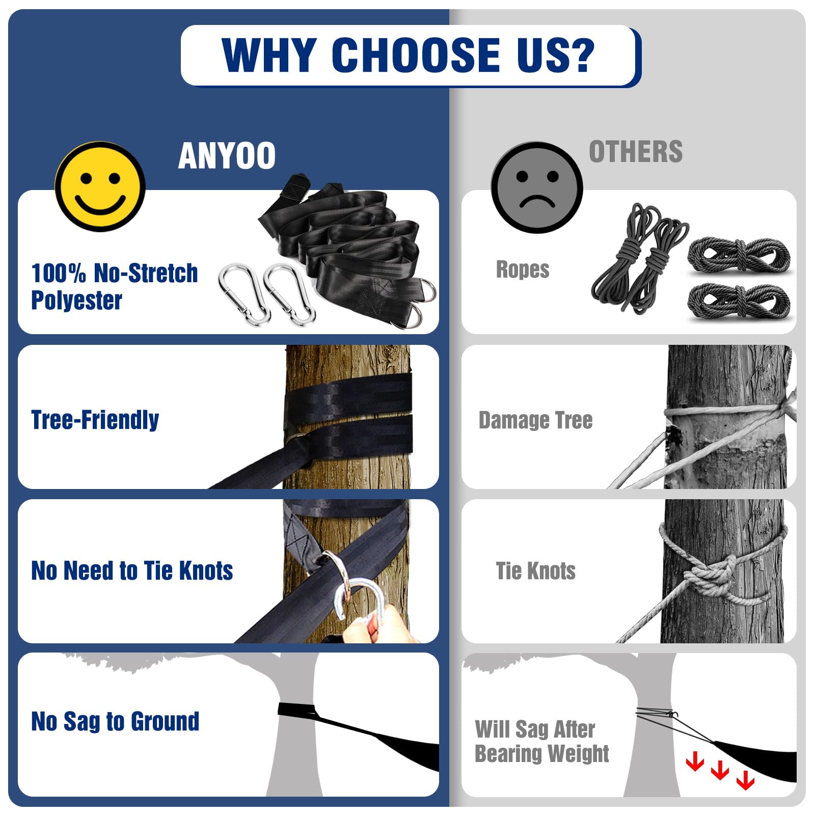 - Suspension System - It comes with tree-friendly high-density nylon straps and 2 carabiners, which makes it easy to set up and take down the hammock without damaging the trees. This type of suspension system used will bring you more comfort and safety of the hammock. And strong enough to support the weight of the hammock and its occupants.