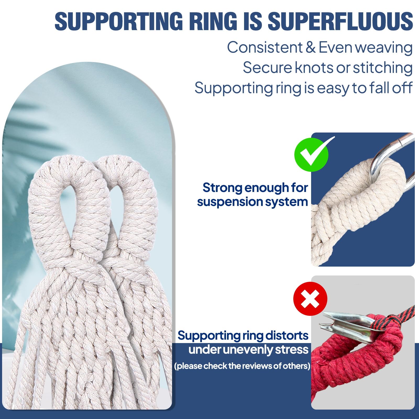 - Comfortable Material - The tightly-woven fabric provides a supportive and comfortable sleeping surface, and the hammock conforms to your body shape to reduce pressure points and provide maximum relaxation. The colorfast cotton is resistant to wear and tear and is designed to withstand outdoor use. Recommended max. load capacity: 250kg (Safety concerns); TUV report max. static load capacity: 300 kg