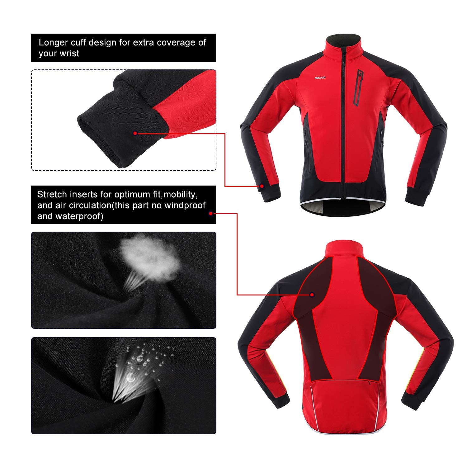 - Stretch inserts for optimum fit, mobility, and air circulation(this part no windproof and waterproof), which can transfer your sweat away, keep your body dry and warm.