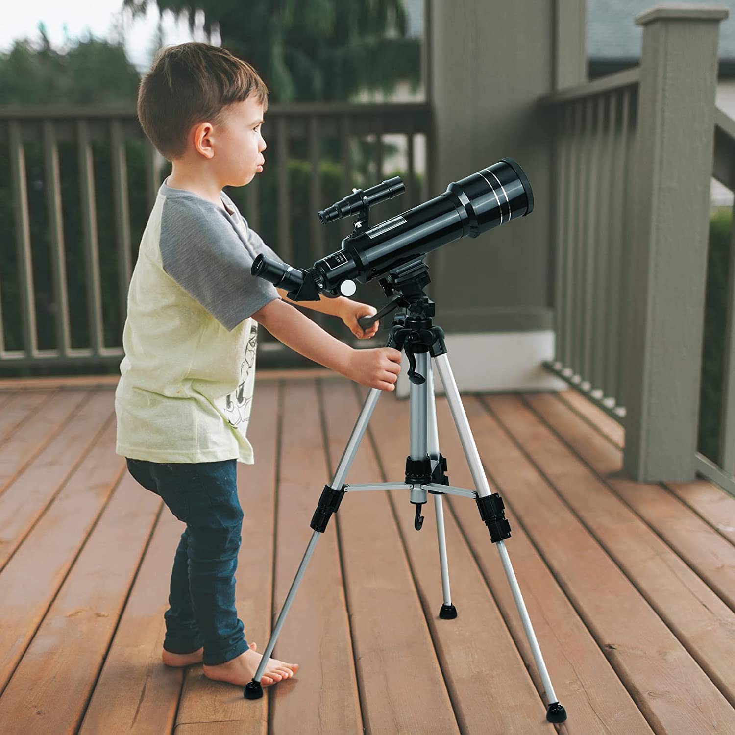 Specifications Optical Design: Refractor Aperture: 70mm(2.75in) Focal Length: 400mm(15.75in) Resolution: 3 secs Focal Ratio: F5.7 Finderscope: 5*24 Zenith Mirrors: 45°Erecting prism Diagonal Upgrated Tripod 360 ° rotationto provides full range of observations. Using the bionic design and the shape of a hoof make the tripod station more stable. 45 ° Diagonal Mirror The image of the refractor is inverted, the image passes through a 45-degree diagonal mirror and the image is positive both up and down. Special Design Put the light things on the hook to ensure the best a balance. The powerful and larger clipps will make it more steady and safer. Mutiple Eyepiece K6mm(67X), K25mm(16X) magnification eyepieces give you variety for any viewing. Q&A: What should you do when your lens is blurry? Answer: Be sure there is no sudden temperature change as that can cause lens fogging. Allow the scope to dry out and temp stabilize. Use only lens quality cleaners, microfiber cloth and typical lens brushes and air puffers. I do not recommend pressurized air like you might use to dust out a computer. Q&A: how old is it suitable for? Answer: 15.75-inch to 40.94inch Adjustable, suitable for both adults and children. Q&A: How sturdy is the tripod? Answer: it should only take a few minutes since there are only a few joins and it's ready to go. The entire setup is a little shaky, so you have to be careful to not move the telescope too much, especially when trying to capture what you're seeing with your phone came.(it has one spirit level to ensure the stable)