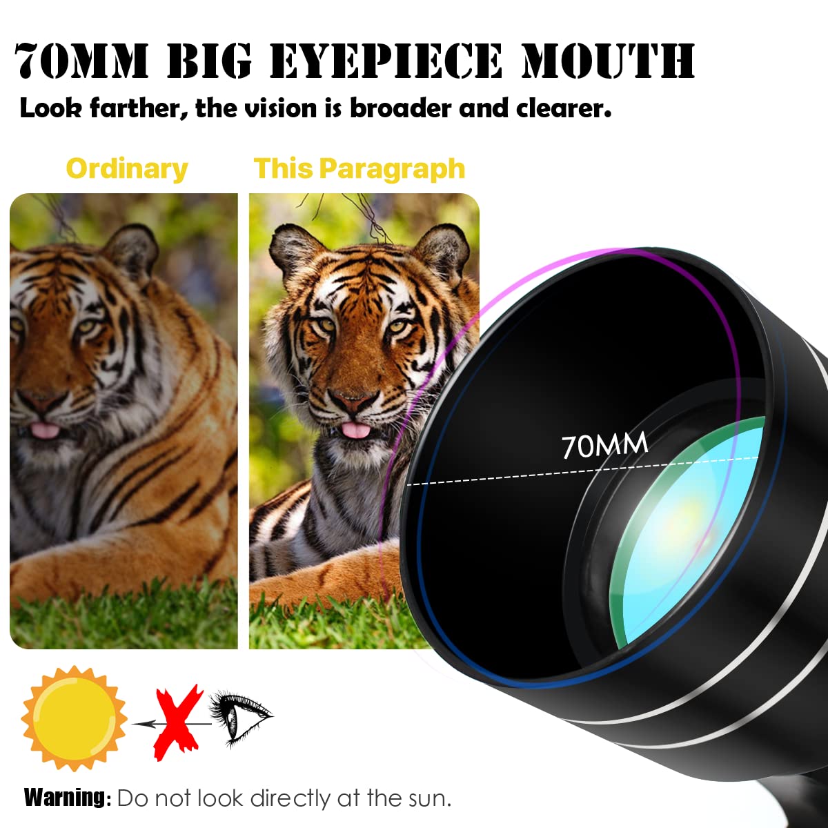 - 1.HIGH-DEFINITION IMAGE: The refracting telescope in 70mm large-diameter is equipped with professional green film lens and anti-reflection coating, with 93% high light transmission and low image loss, thought which you can observe a clear image. Suitable for kids, astronomy and geography enthusiasts.