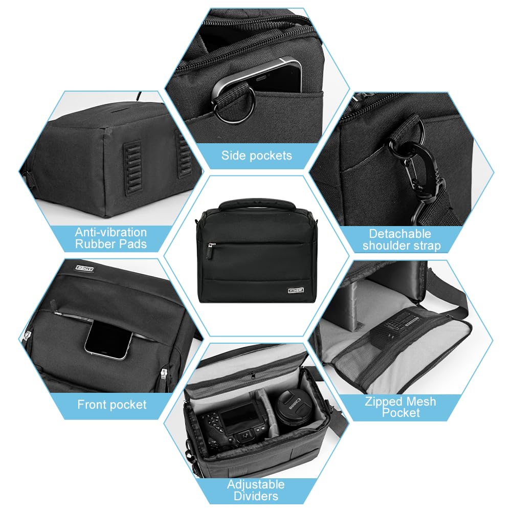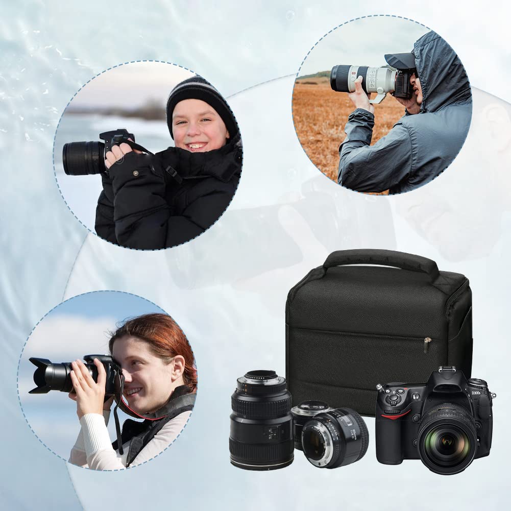 - 【Practical And Convenient】The camera bag has a widened handle to make it easier to carry. The bag has 2 removable and sliding dividers, making it universal for different types of cameras. Side pockets and front zip pocket can be used to store accessories such as batteries, chargers, memory cards and mobile phones, while an additional inner mesh pocket is designed for storing small items such as ID cards.