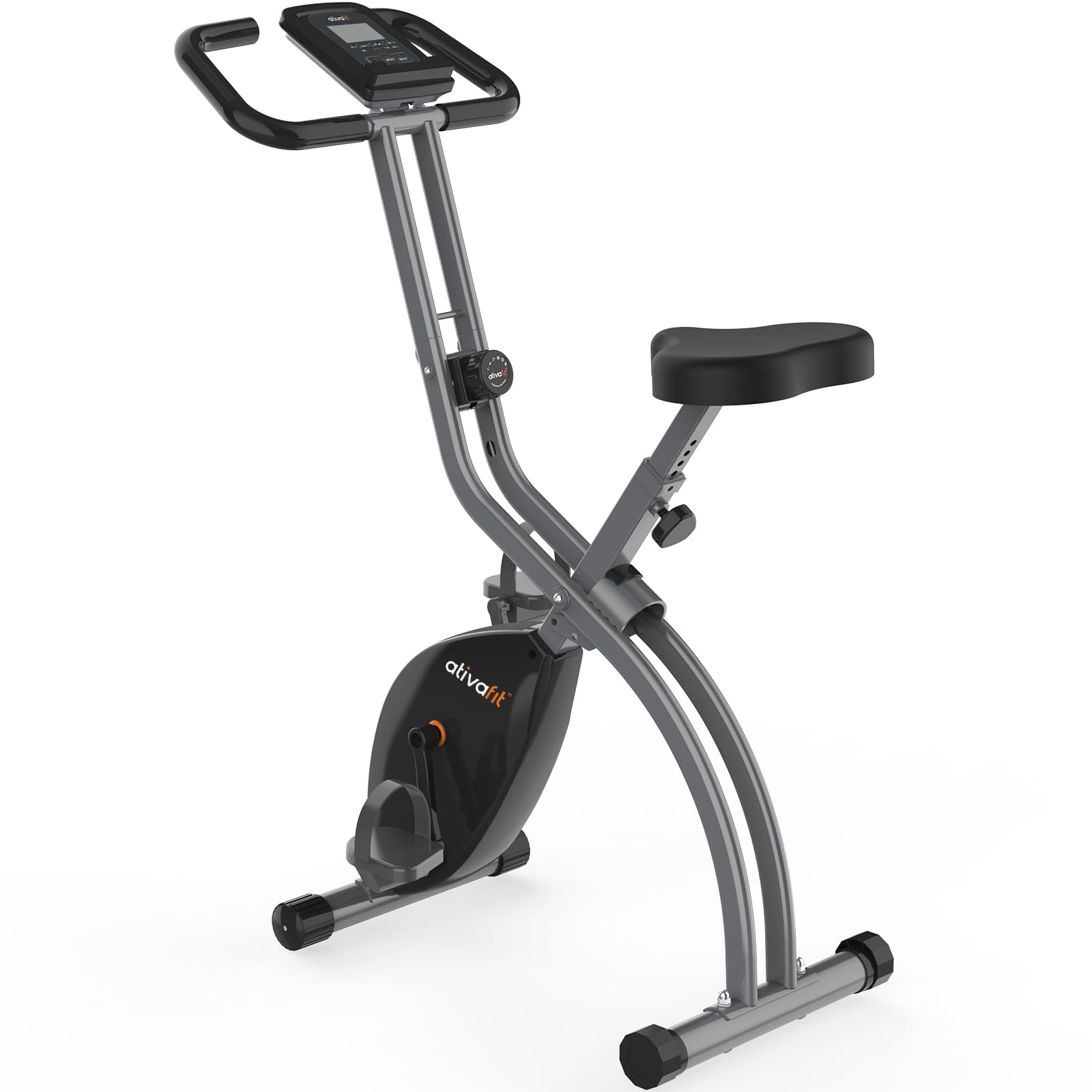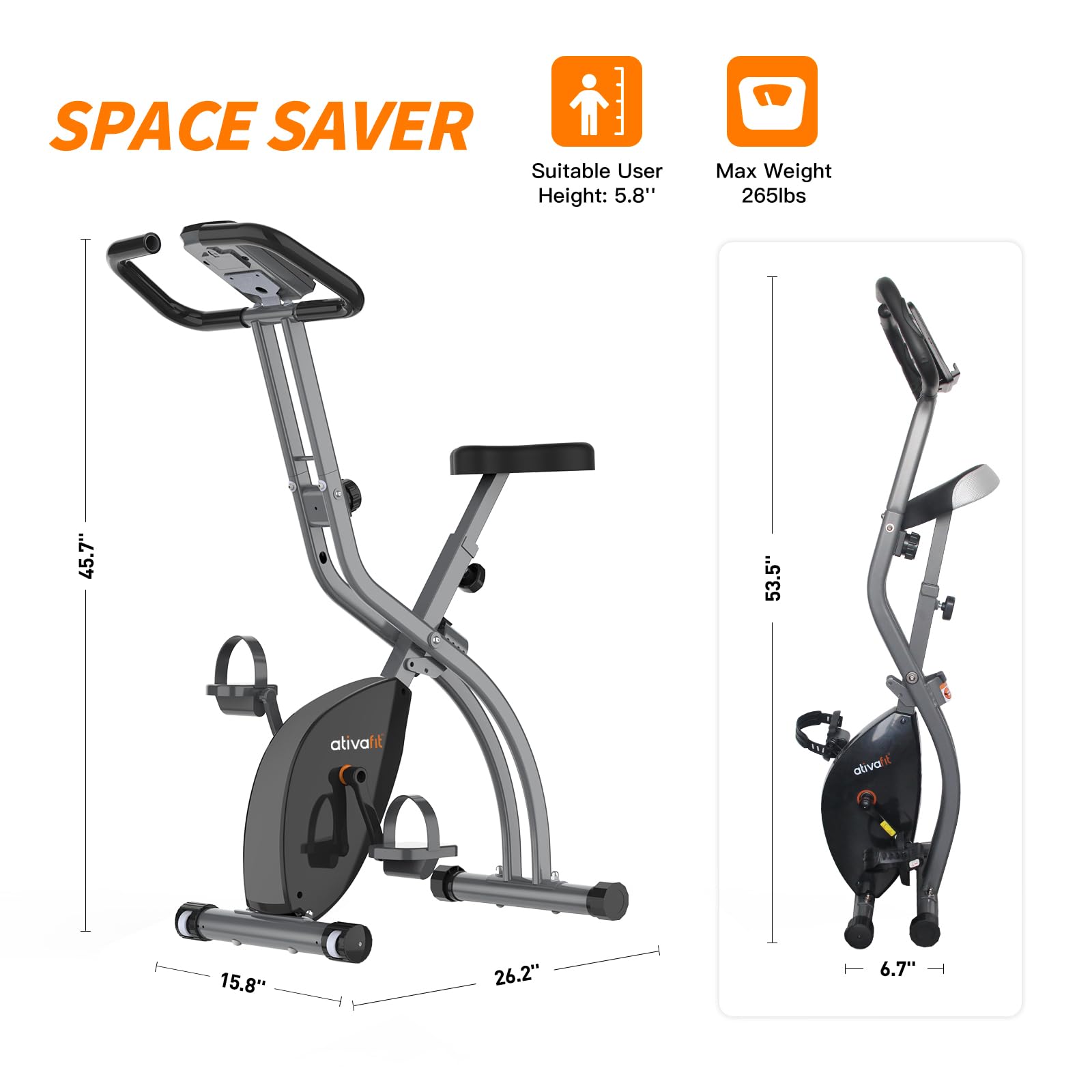 Details: Ativafit Indoor Exercise Bicycle is smooth and quiet, which make the exercise convenient and effective, a range of adjustable resistances meet your requirement about the exercise intensity. Equipped with a table bracket, it is convenient to watch TV when you are cycling Features Solid X-Frame Design folds to only 15.8" x 6.7" of floor space when not use LCD display Console with IPAD bracket effectively tracks your fitness progress with the easy to read ---speed, time, distance, hand pulse, calories. Pulse grips in the handlebars measuring your pulse rate is an important tool for exercising correctly and efficiently. 8 levels of smooth magnetic resistance, you can adjust the level according to your own need. Foot straps keep your feet saddled in also providing a non-slip surface, then you can focus on the exercise without worrying unbalanced. Transport wheels allows you to move the bike from room to room, No need for heavy lifting or muscle strain 3.3 lbs precision balance flywheel with friction-free magnetic resistance provides you a smooth, quiet and maintenance * operation Comfortably fits most users from 4'10" to 6'10" tall Weight limit: 265 lbs Folded dimensions ---26.2" x 15.8" x 45.7" Assembled dimensions --- 6.7" x 15.8" x 53.5" Assembled weight ---34.2 lbs *: 1-year frame 120 days parts