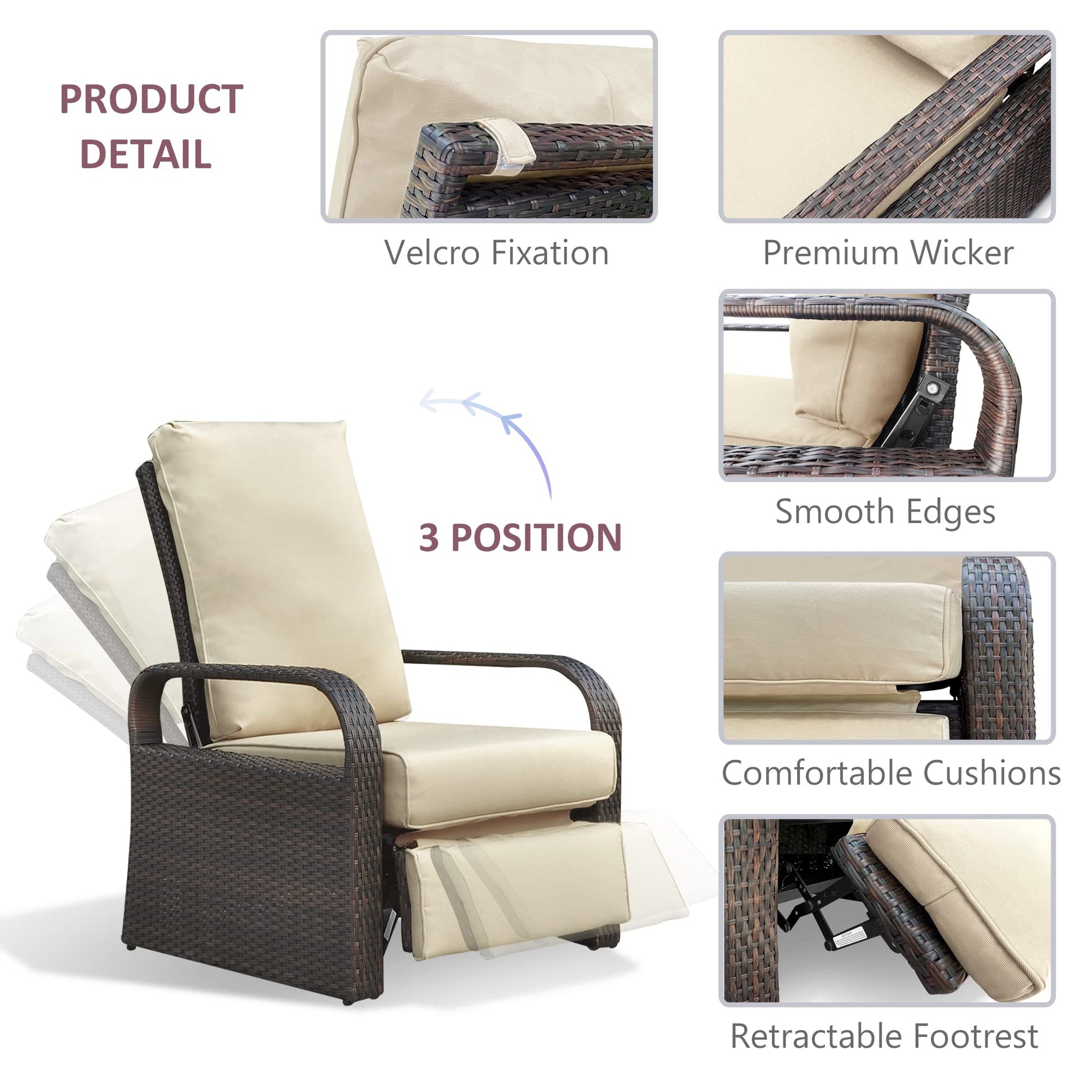 ATR ARTTOREAL Garden Recliner Chair,Patio Reclining Rattan Adjustable Position Height Armchair with Footrest and Backrest,Aluminum Frame,Brown Hand-woven Wicker,Khaki Color