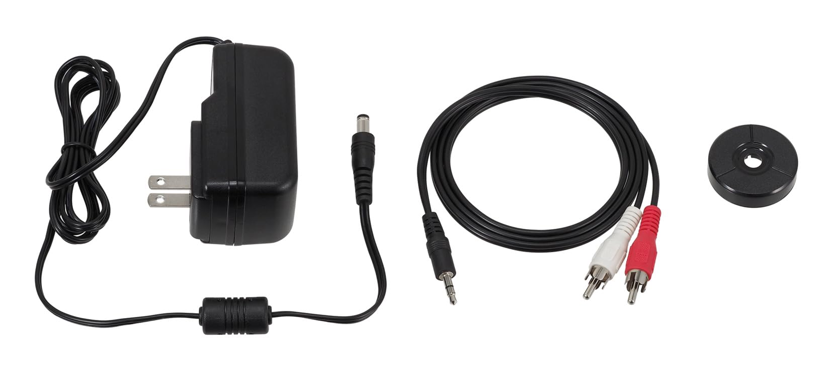 - Includes: detachable RCA output cable (3.5 mm male to dual RCA male), 45 RPM adapter, and removable hinged dust cover
