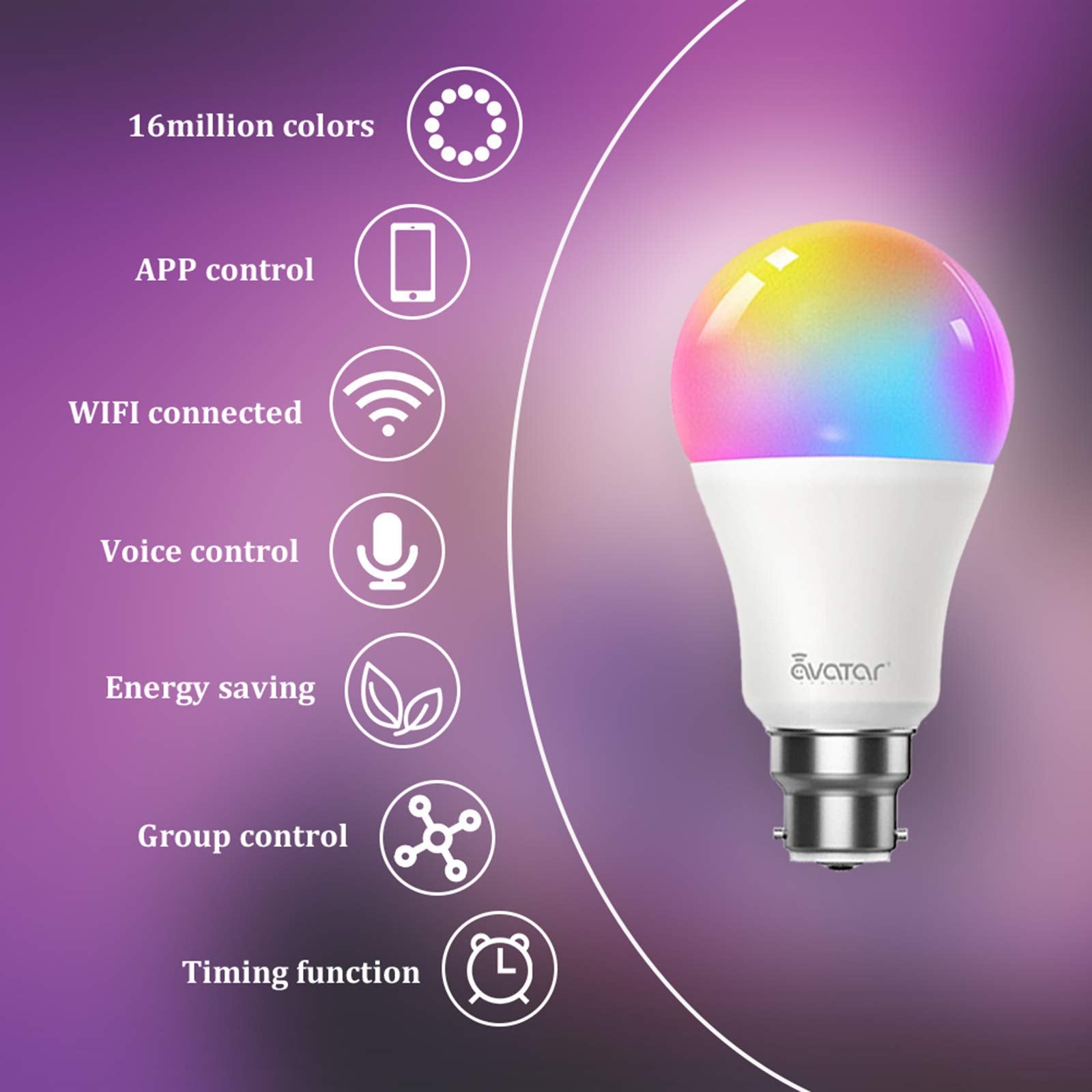 Avatar Controls Smart Bulb Alexa Light Bulbs B22 Bayonet, Colour Changing WiFi LED Lamp Bulbs 9W Set of 2 Bulbs [Energy Class F], White