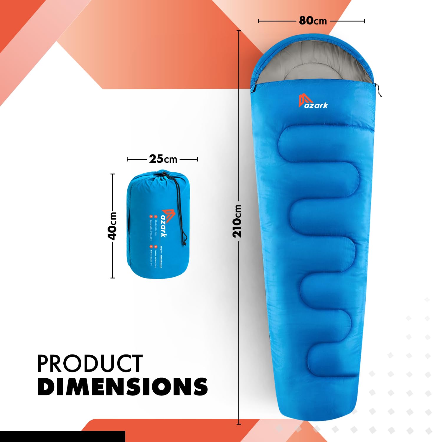 - ❄️ azark Sleeping bag – The dimensions are 210cm x 80cm. Comfortable temperature between +7° and +20° degrees celsius. -4° degree celsius for extreme conditions