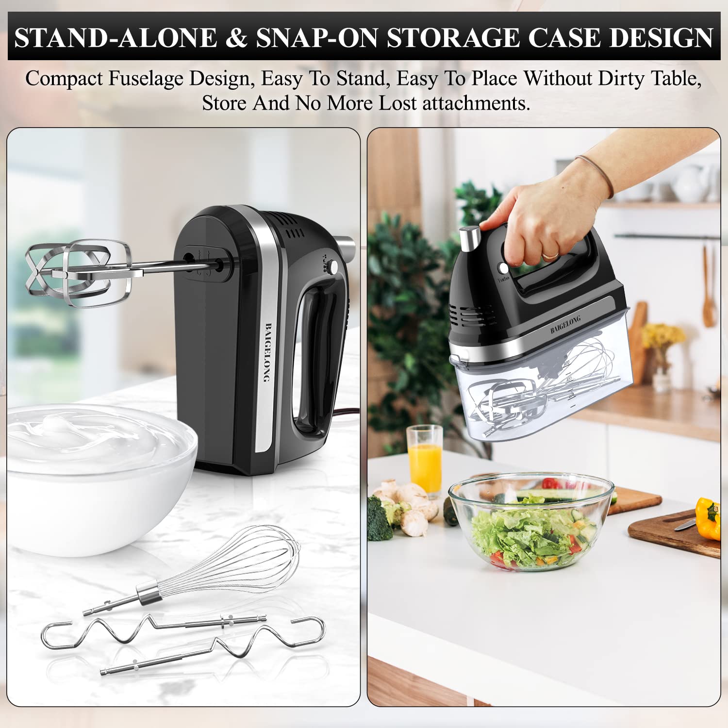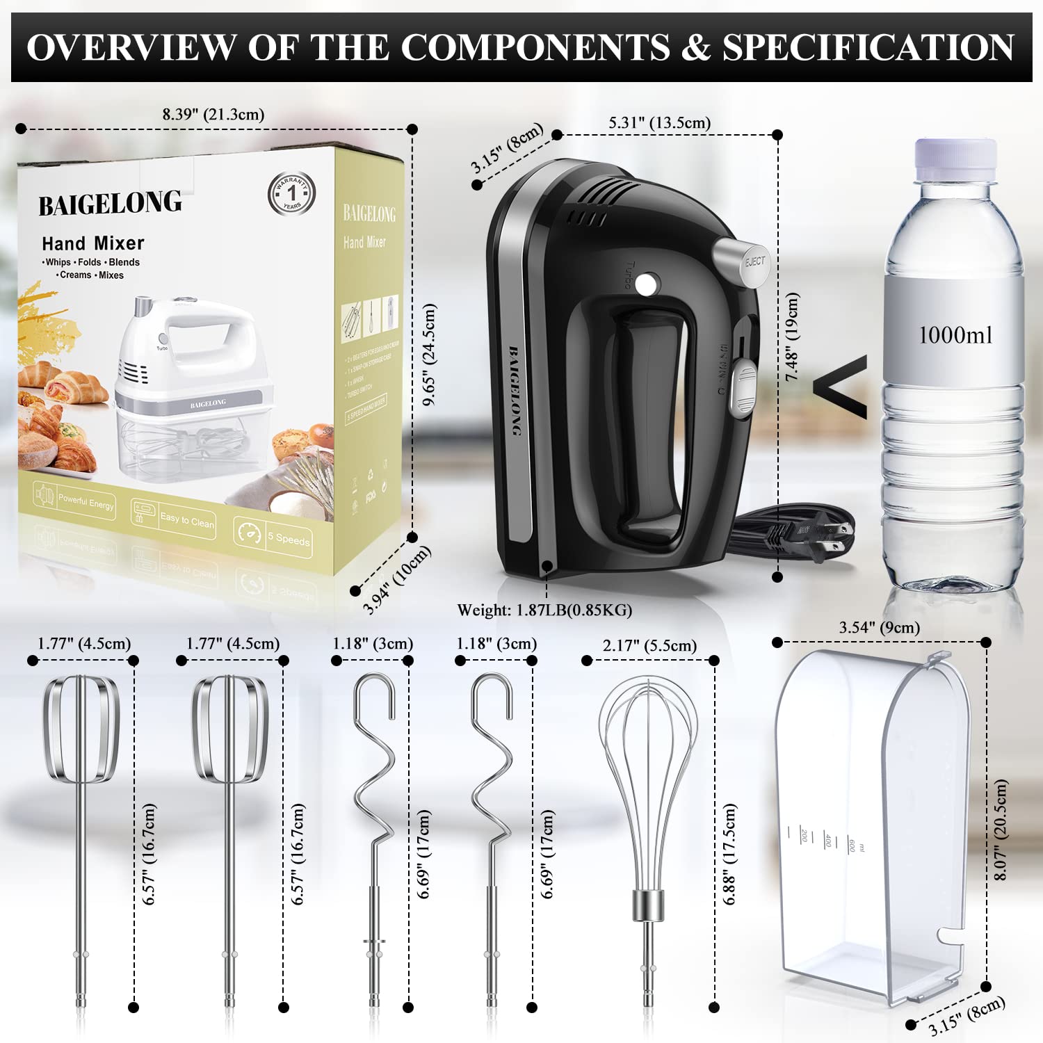 Details: Baigelong Hand Electric Mixer, 300W Ultra Power Food Kitchen Mixer With 5 Self-Control Speeds + Turbo Boost, 5 Stainless Steel Attachments Handheld Mixer For Baking, Black