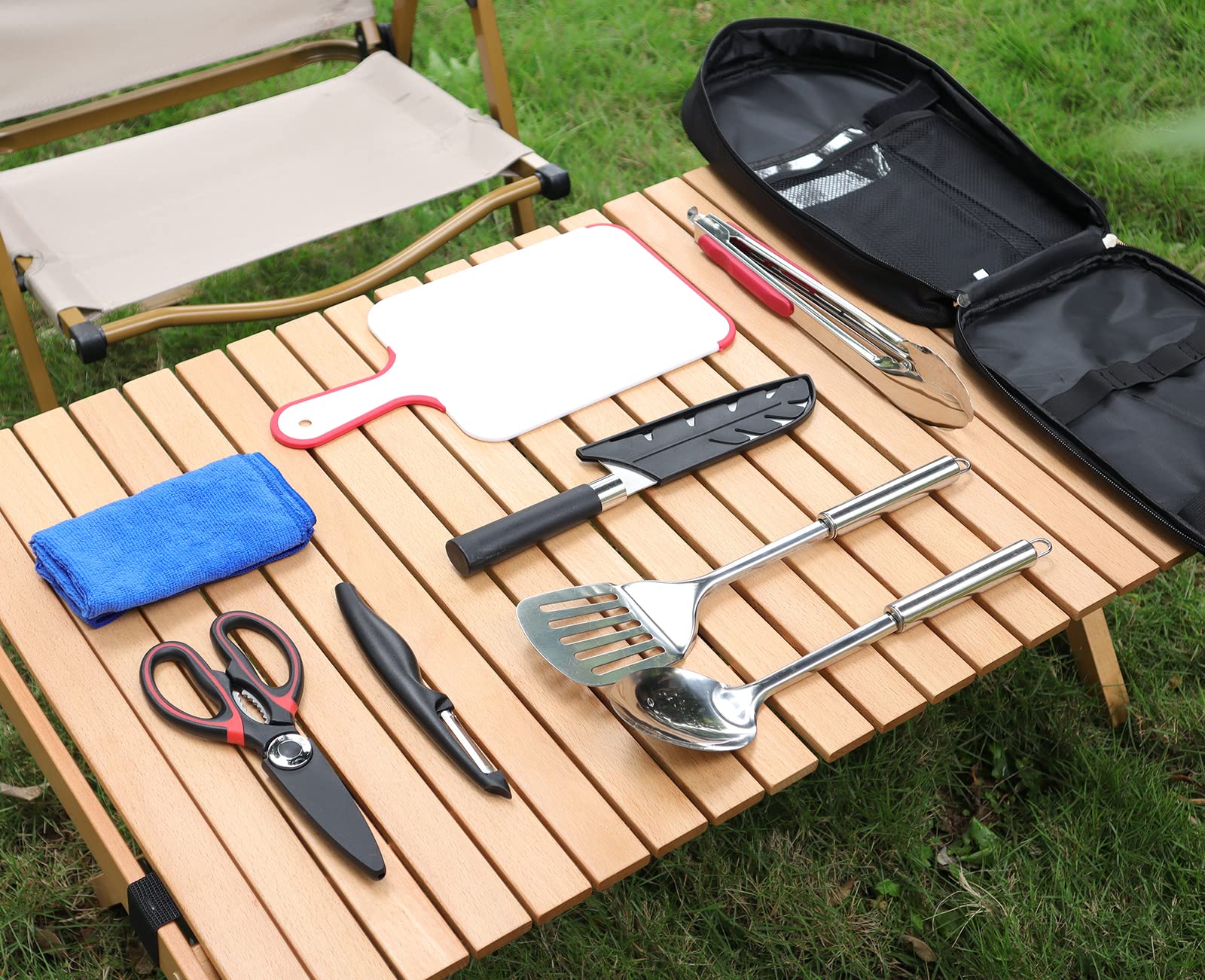 - 【Camping Utensils Kit】Include Knife ,Tongs, Multi-function Scissors, Spoon, Spatula, Peeler, Cutting Board, Cleaning Cloths and Storage Bags.