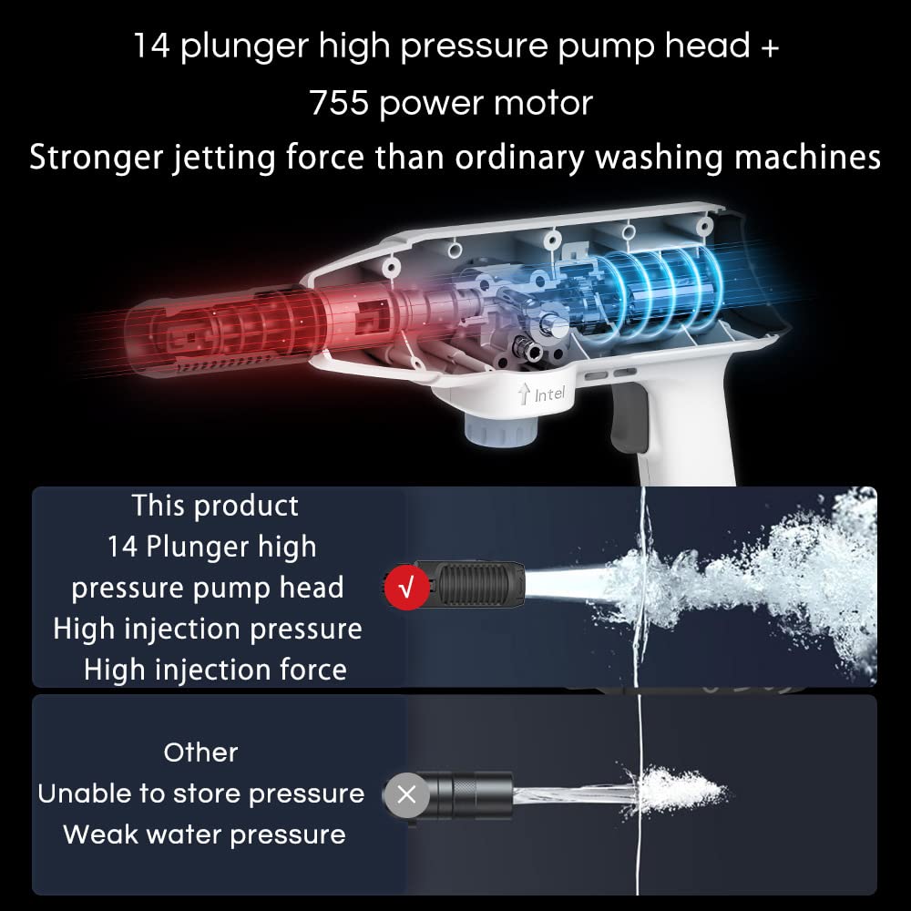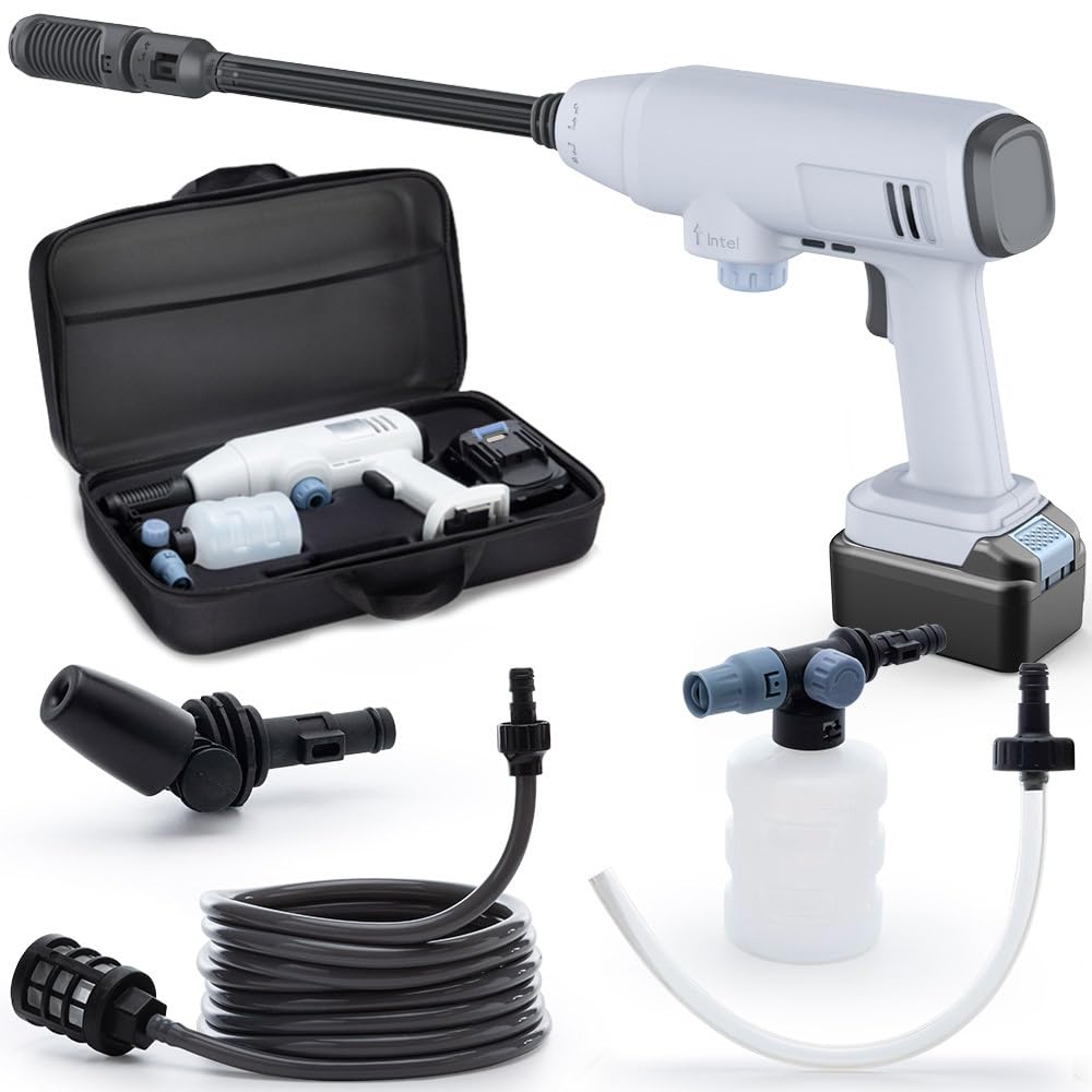 - [Compact Kit] With one-time purchase, you will get the whole package including: high pressure washing gun, lithium battery, charger, Water supply hose with filter (5m), water supply hose for plastic bottles, rotary nozzle, extension rod, direction adjustment nozzle, foam pot, storage box, manual.