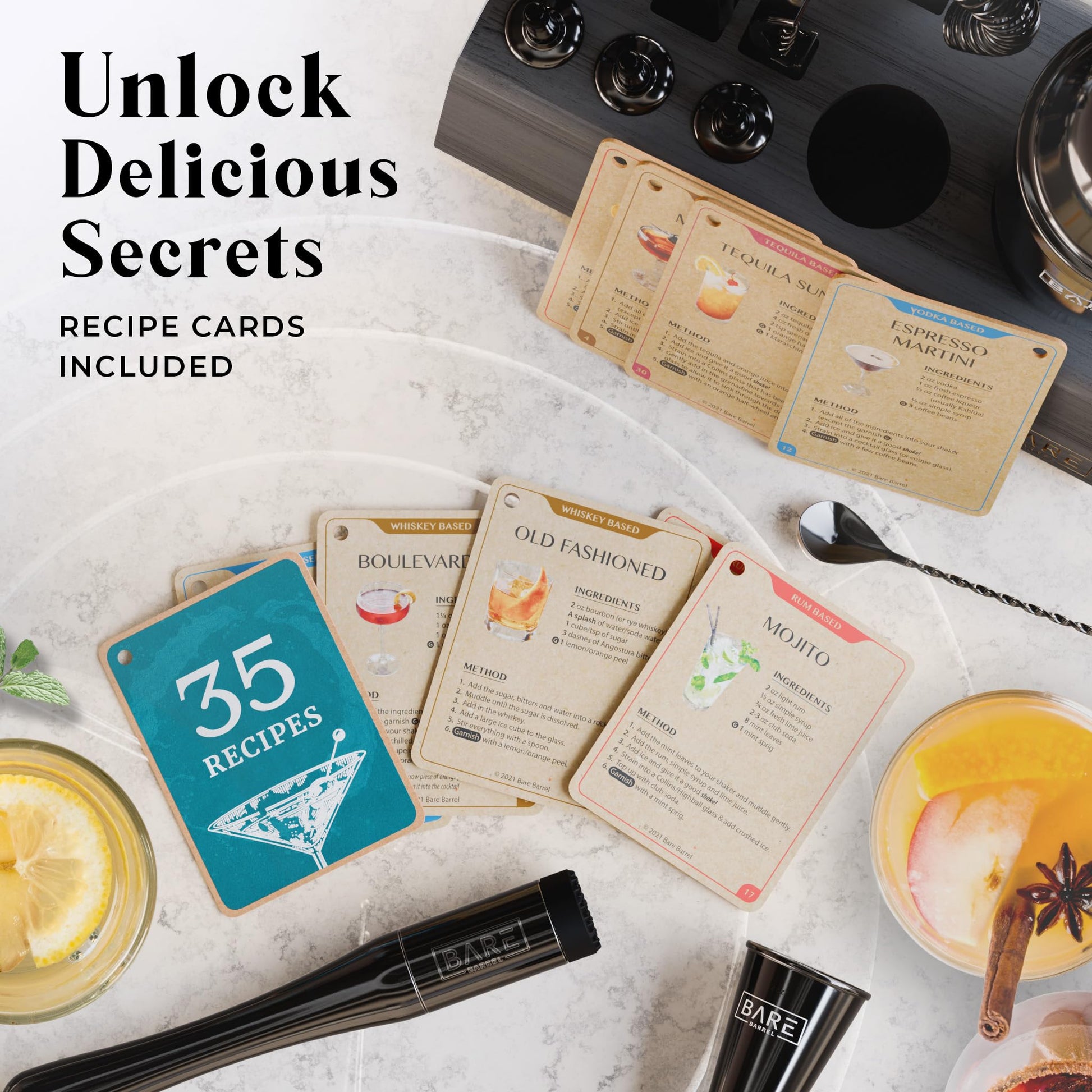 - ✔ ENDLESS TASTY RECIPES » Includes 35 recipe cards, so whether you fancy the taste of whiskey, vodka, rum, gin or tequila, you're covered! Enjoy an Old Fashioned, Margarita, Martini, Mojito...