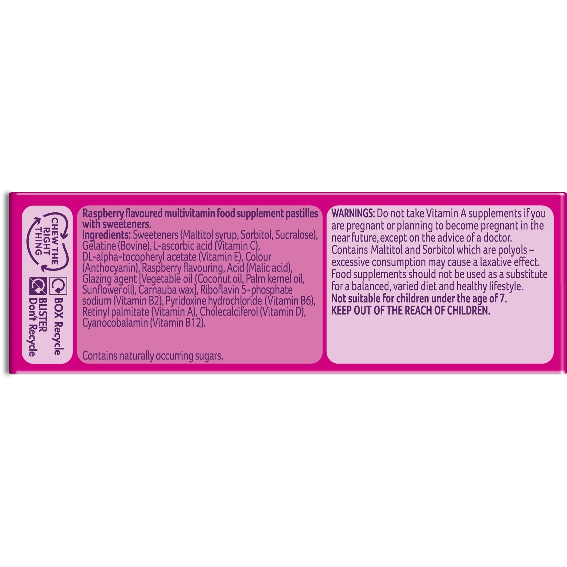 Sweeteners (Maltitol Syrup, Sorbitol, Sucralose), Gelatine (Bovine), Vitamin C, Vitamin E, Colour (Anthocyanin), Raspberry Flavouring, Acid (Malic Acid), Glazing Agent [Vegetable Oil (Coconut Oil, Palm Kernel Oil, Sunflower Oil), Carnauba Wax], Riboflavin (Vitamin B2), Vitamin B6, Vitamin A, Vitamin D, Vitamin B12