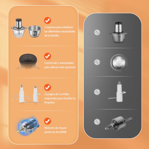 - šŖ[2-SPEED SETTING] Meat grinder power 600W for easy chopping, slicing, and mixing a variety of foods in a short time. Level 1 is for easy-to-chop foods like vegetables, fruits, garlic, chilies, onions, or cold soups. Level 2 is suitable for hard foods like meats, nuts, carrots, ham, or cheese.