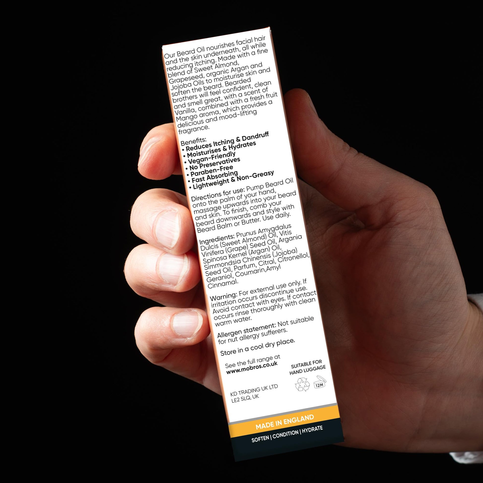 Details: Product Description Mo Bro's beard oil mixes the finest natural ingredients, leaving your beard shiny, moisturised and smooth, not to mention that it will smell amazing. This will be your beard's best friend and will moisturise your skin, promote hair growth and prevent dandruff, leaving your beard with a healthy- looking shineChoice of Scents:Vanilla and Mango - rich in vitamin B, whilst helping to maintain healthy skin and hair. The fragrance is subtle and contains a hint of creamy coconut, white chocolate and a whisper of fresh candyflossCedarwood - a wonderful smell that contains a woody, sweet, sharp note fragrance. Great oil for dry scalp and hair growthSandalwood - gives a sweet and woody fragrance, distilled from the chipped heartwood of mature sandalwood trees.Sweet Mint - has a soothing and calming scent, used to strengthen hairOrange Bergamot - fabulous for maintaining healthy, smooth and glamorous skin, which holds a great sweet citrus fragranceWinter Spice - cinnamon gives a warm spicy scent and has a major benefit for skin as it helps to enhance skin complexionSummer Spice - a lighter version of winter spice. Combining notes of cinnamon clove with ripe plum and freshly crushed vanilla pods. Unscented - If you prefer to use product with no scent this is ideal for youInstructions of use:Pour 2-8 drops of oil into the palms then reverently work it in from underneath your beard before smothering it from the topThe quantity of oil required will depend on your beard lengthWe recommend using 2-4 drops for a short beard, 4-6 for a medium and up to 8 drops for blue-ribbon beard owners Ingredients Sweet Almond Oil, Grapeseed Oil, Argan Oil, Jojoba Oil & Fragrance Oils Directions The quantity of oil required will depend on your beard length. We recommend using 2-4 drops for a short beard, 4-6 for a medium and up to 8 drops for blue-ribbon beard owners. Pump Beard Oil onto palm of your hand, massage upwards into your beard and skin. To finish, comb your beard downwards and style. Use daily. Safety Warning not suitable for anyone with nut allergies