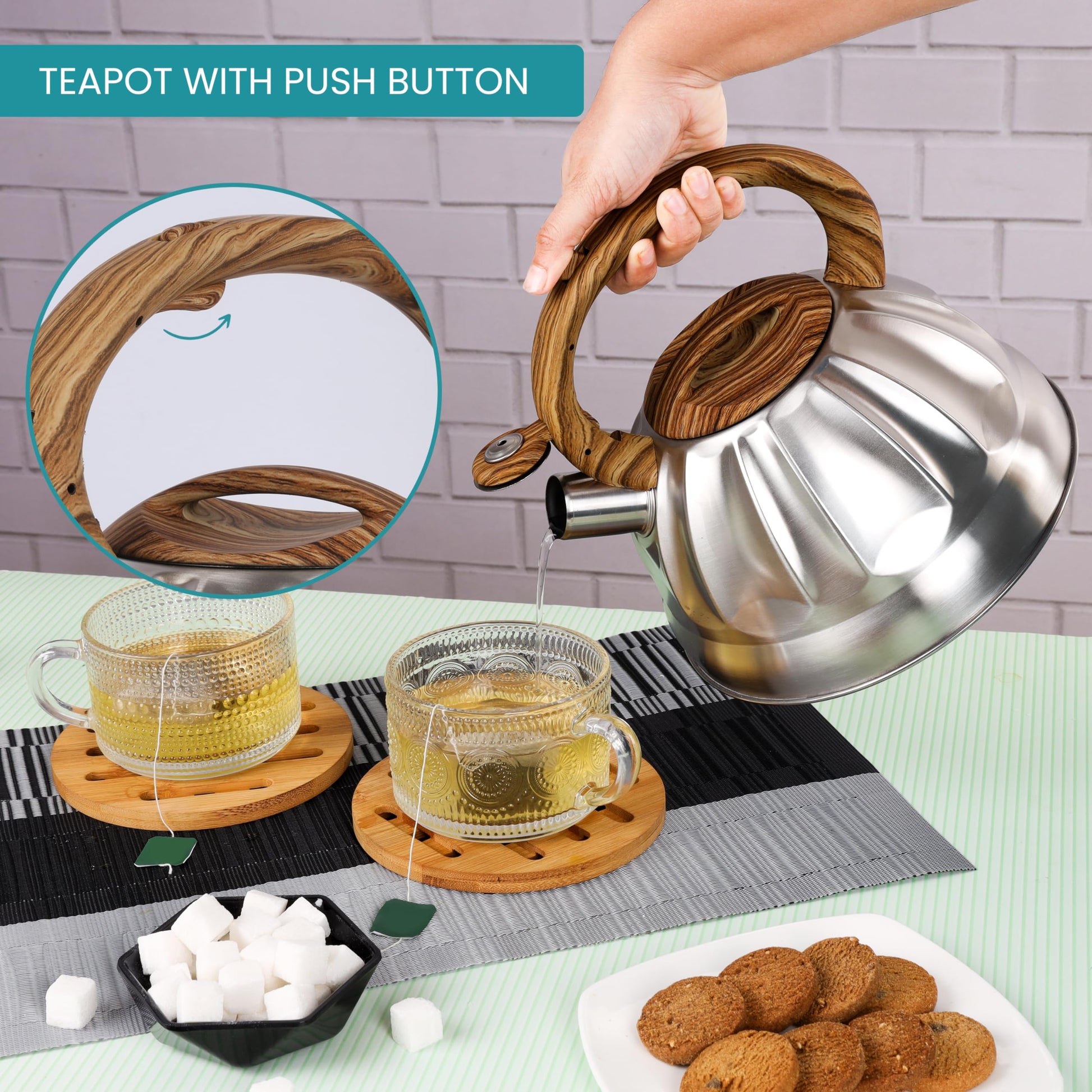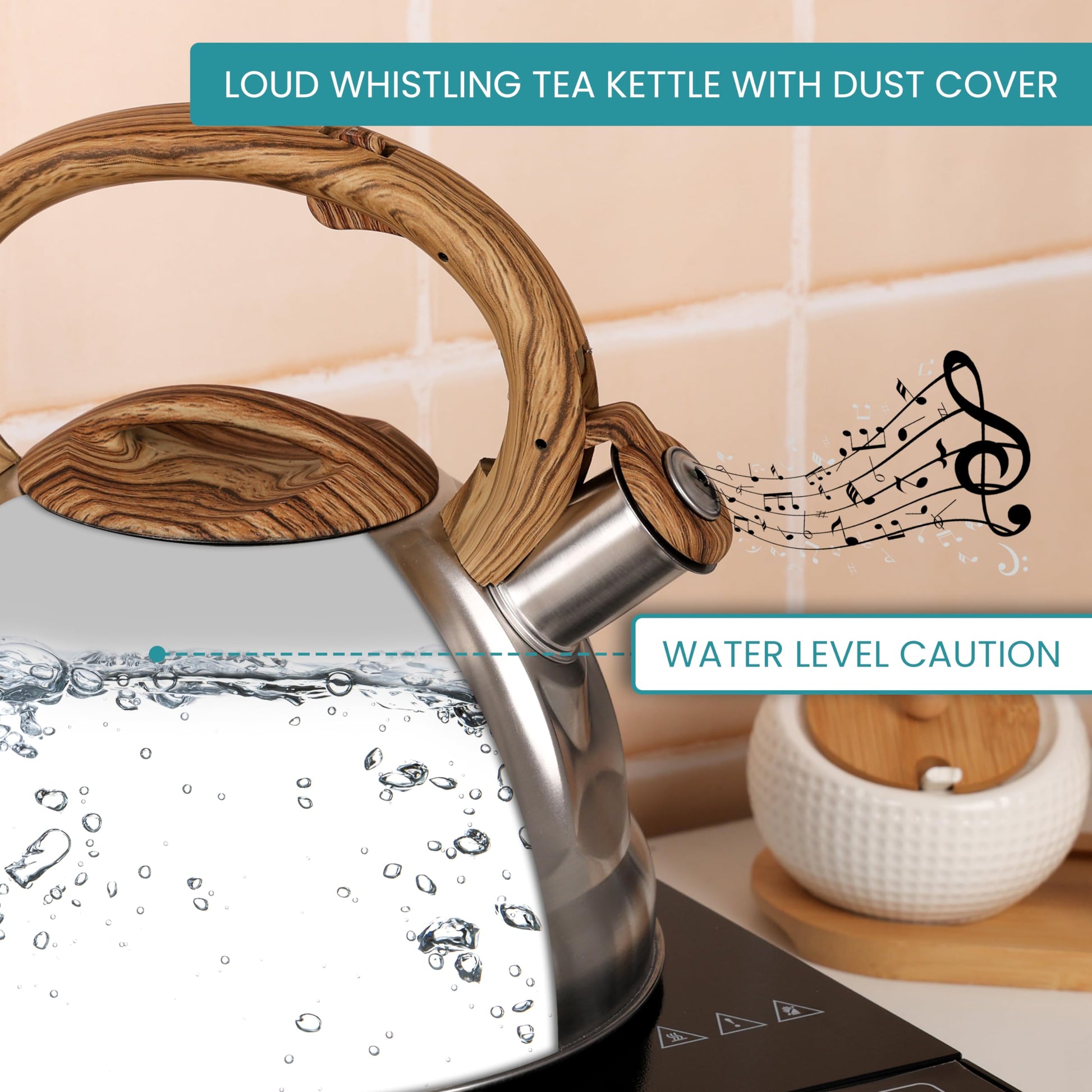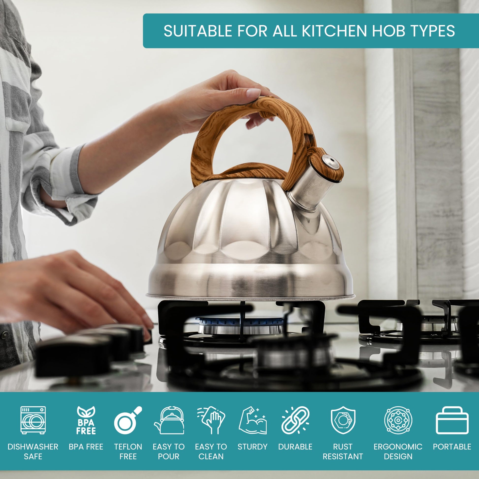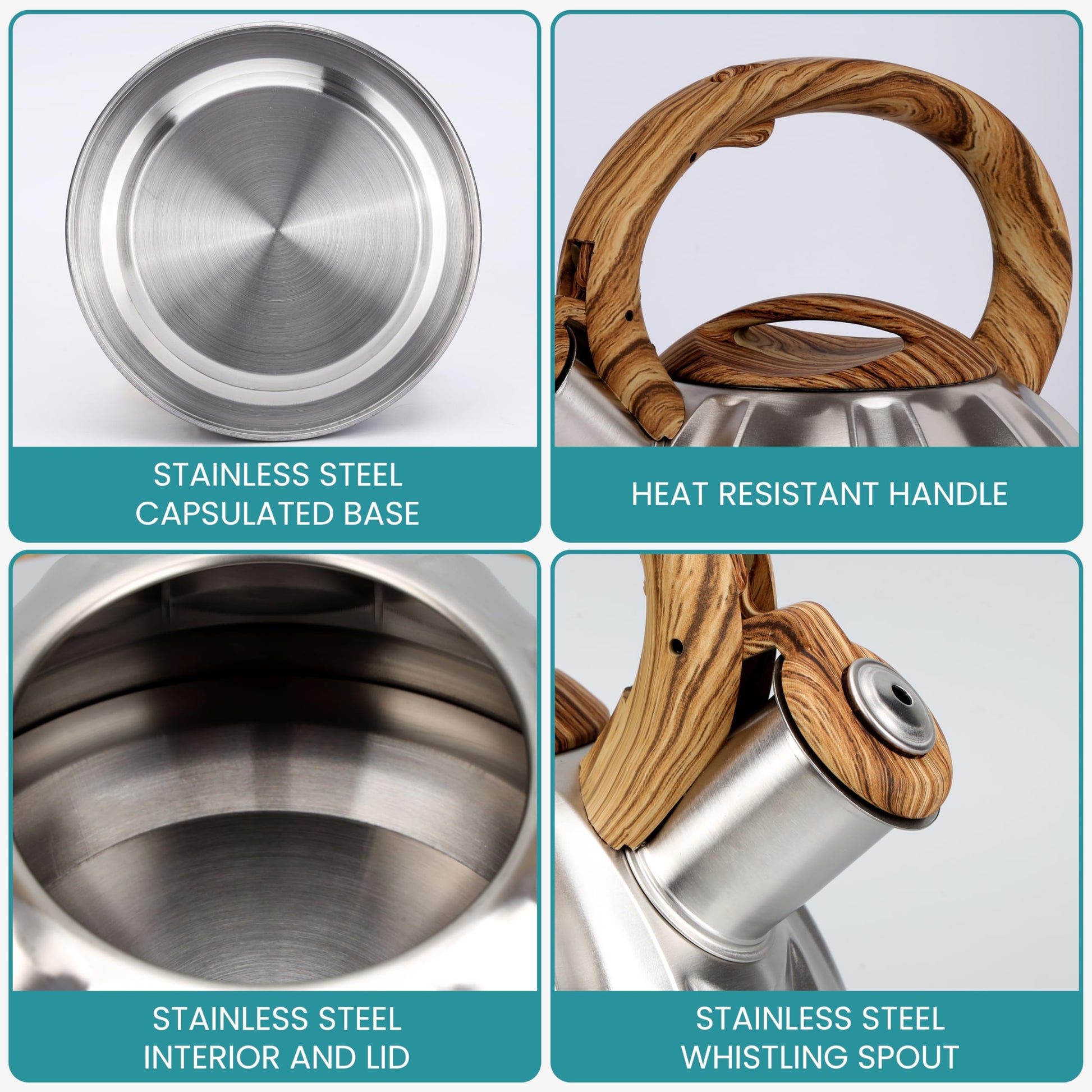 - CONVENIENT POURNIG: Featuring a heat-resistant, plastic, easy-grip handle - with a wood-grain design; our stovetop water kettle is convenient to pour. There is a one-handed trigger mechanism which opens the lid, allowing you to pour your hot tea/coffee with ease.