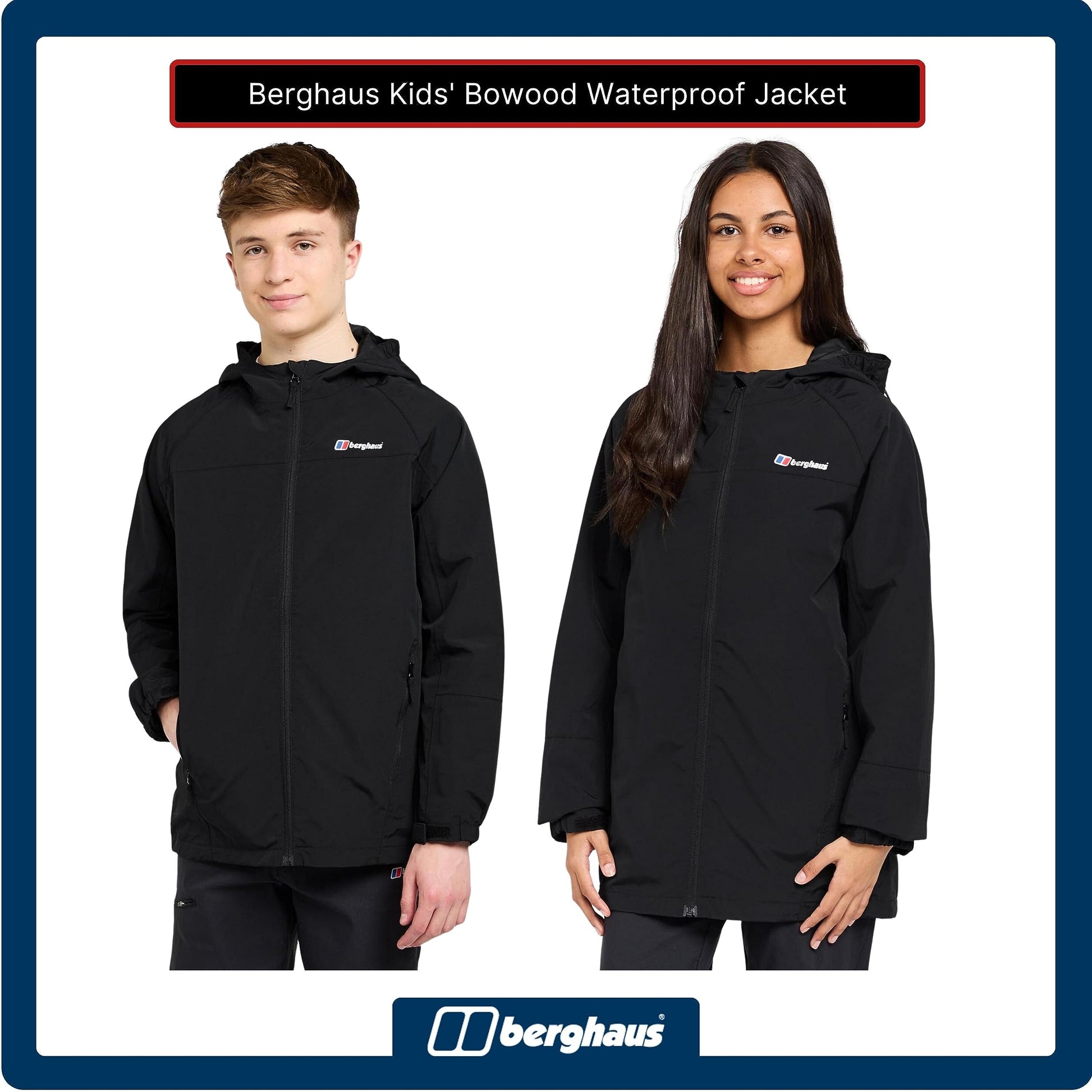 Berghaus Bowood Kids' Waterproof Jacket with Adjustable Hood, Kids' Rain Coat, Kids' Hiking & Outdoor Recreation Clothing (13 Years, Black)