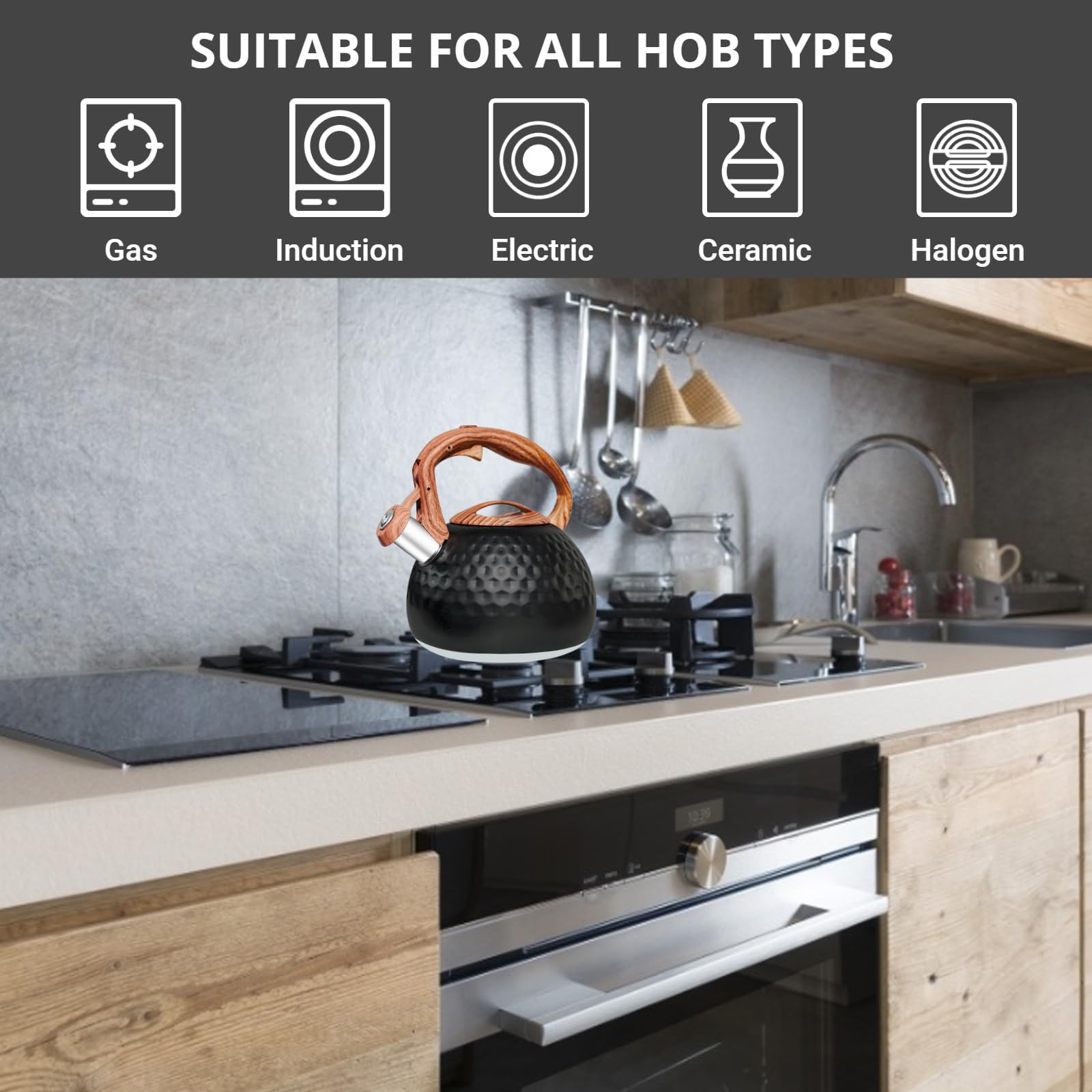 Beruyu Stove Top Whistling Kettle, Stainless Steel Teapot with Wood Grain Handle, for Gas Stove Induction Cooker, 3L (Black)