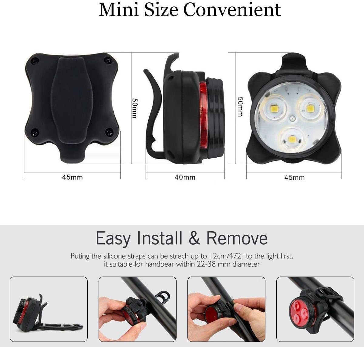 - 【Easy to Installation】:Stretchy watch band strap design is very easy to affix securely to your bike. This rechargeable bicycle light set comes with 4 flexible silicone mounting straps that provide an easy instalment and stronghold, Fits all kinds of bikes. Neither does it fall nor get loose even on rough terrains.You can fasten or loosen it with no effort or tools when needed.