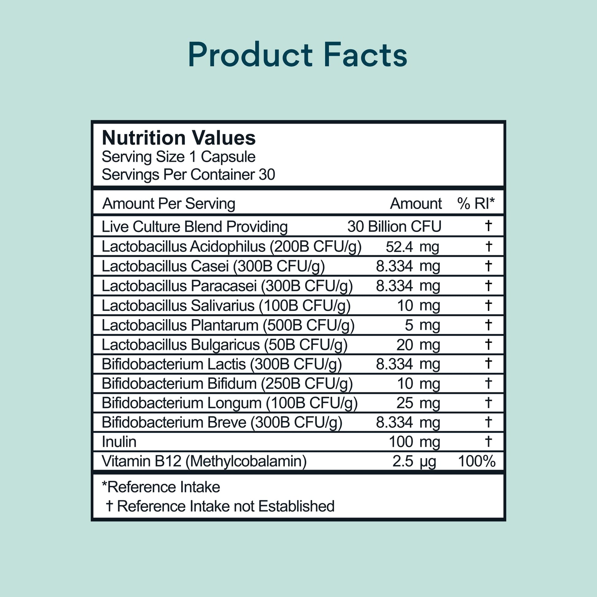 Details: Product description Our market-leading Probiotic Complex packs a powerful 30B CFU of 11 different strains of highly beneficial and researched bacteria. This vegan friendly, third party tested formula is made locally in the UK and includes a prebiotic for maximum efficacy. Ingredients Probiotic, Prebioitc (Inulin), Vitamin B12