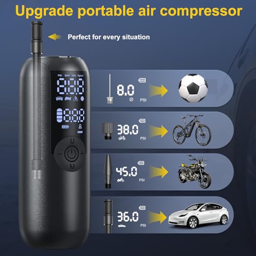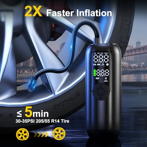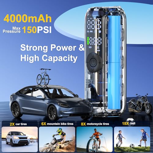 - 【150PSI Bike Pump】The portable tyre inflator provides a maximum pressure of 150PSI, which can fully inflate mountain bike tires within 2 minutes, and quickly inflate car tires from 30PSI to 35PSI within 5 minutes (based on test data from standard tires 205/55/R14).