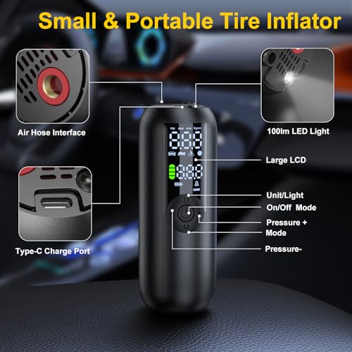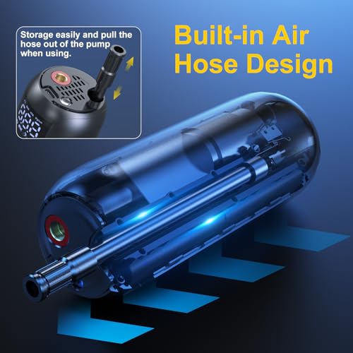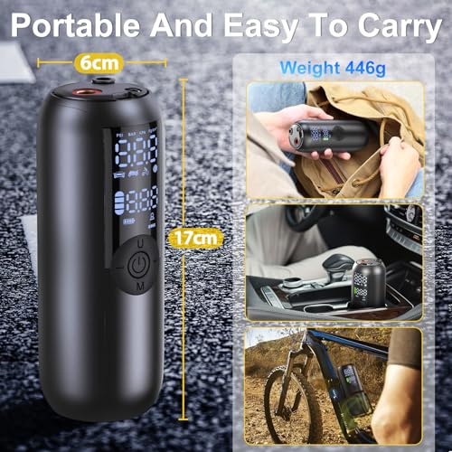 - 【Ultra Compact and Portable】The electric bike pump has a built-in hose storage location, eliminating the need to worry about carrying or losing the hose. The bike pump is only 6.6''H x 2.4''W and weighs only 446g. It is easy to store in frame-mounted bottle holder, or bike saddle bag, seat packs, etc.