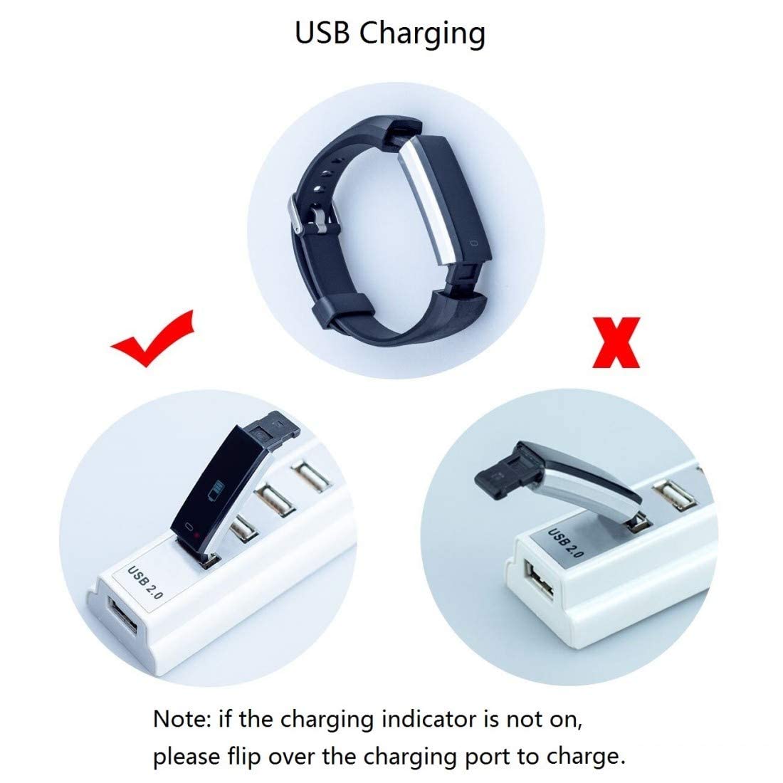 Warm Tip: Before initial use, please detach the fitness tracker watch from the strap and put the built-in USB interface into a USB port to boot it up. If no red indicator shows please flip it over to to the opposite direction to recharge it.